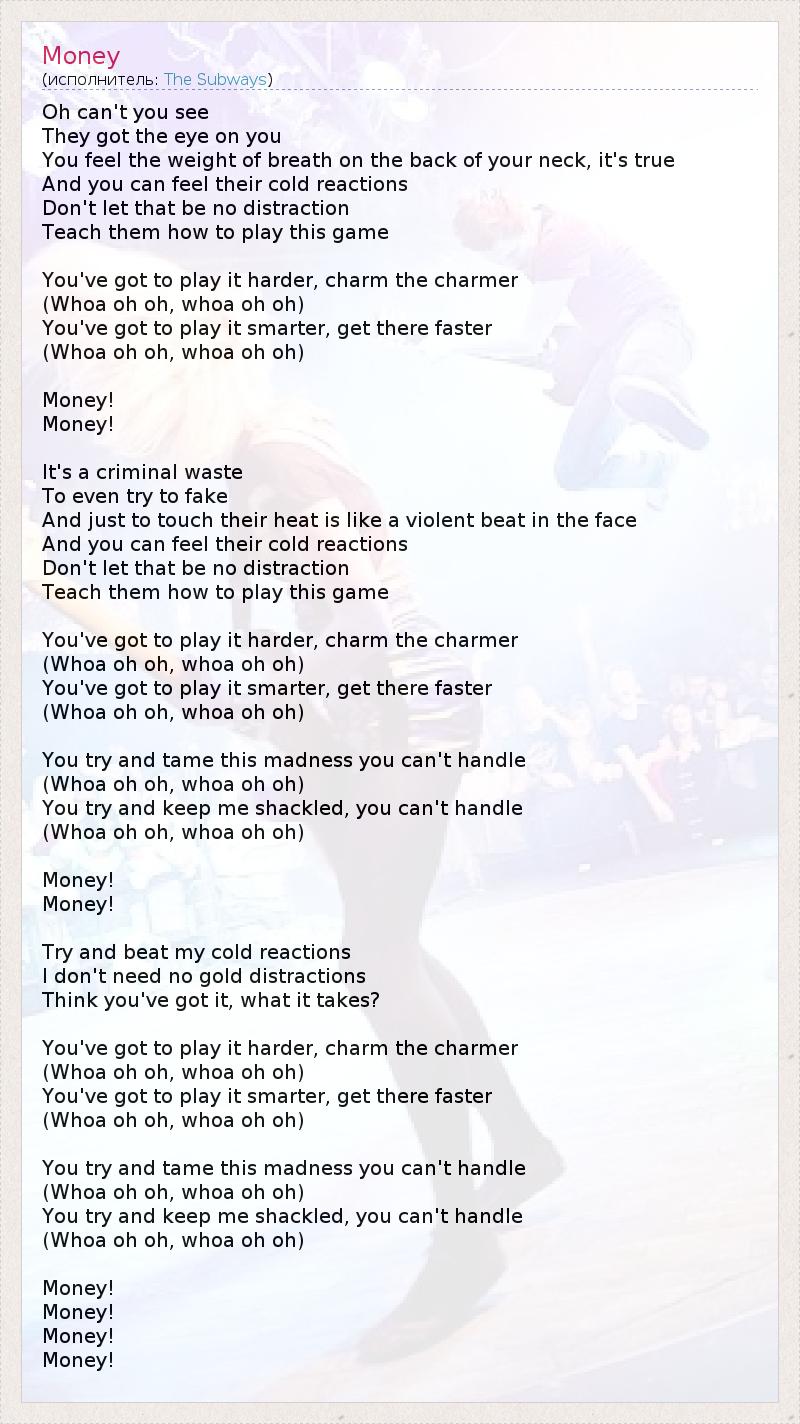 Money and Celebrity is the third studio album by English trio The Subways, produced by Stephen Street. It was released on 18 September 2011.The album is assisted by fans with them providing photos and cover artwork to the band through their PledgeMusic project in which donations are made to the band for a charity and the donor receives anything from just the new CD to a 2 summer pass to every date the band perform.