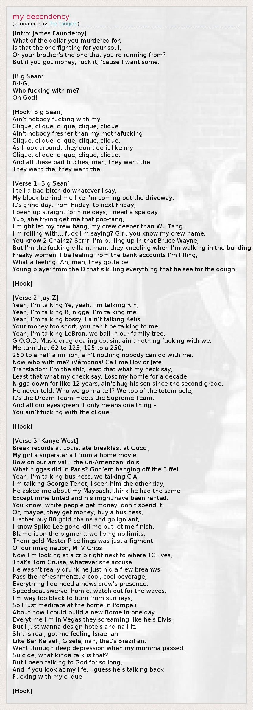 3 – Джей-Зи – основатель и владелец звукозаписывающей компании Roc-A-Fella Records. Йе (Канье Уэст) и Ри (Рианна) заключили с ней контракты. Би (Бейонсе) – жена Джей-Зи. Келис – американская певица и автор песен; бывшая жена товарища Джей-Зи, Наса.