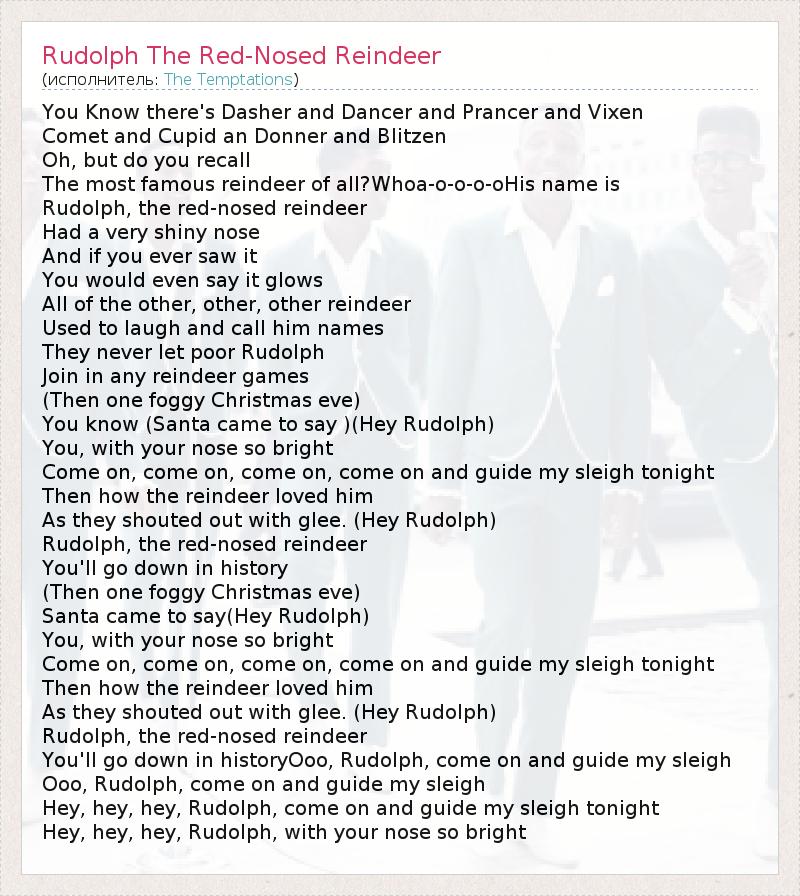 You Know there's Dasher and Dancer and Prancer and Vixen Comet and Cupid an Donner and Blitzen Oh, but do you recall The most famous reindeer of all?Whoa-o-o-o-oHis name is Rudolph, the red-nosed reindeer Had a very shiny nose And if you ever saw it You would even say it glows All of the other, other, other reindeer Used to laugh and call him names They never let poor Rudolph Join in any reindeer games (Then one foggy Christmas eve) You know (Santa came to say )(Hey Rudolph) You, with your nose so bright Come on, come on, come on, come on and guide my sleigh tonight Then how the reindeer loved him As they shouted out with glee. (Hey Rudolph) Rudolph, the red-nosed reindeer You'll go down in history (Then one foggy Christmas eve) Santa came to say(Hey Rudolph) You, with your nose so bright Come on, come on, come on, come on and guide my sleigh tonight Then how the reindeer loved him As they shouted out with glee. (Hey Rudolph) Rudolph, the red-nosed reindeer You'll go down in historyOoo, Rudolph, come on and guide my sleigh Ooo, Rudolph, come on and guide my sleigh Hey, hey, hey, Rudolph, come on and guide my sleigh tonight Hey, hey, hey, Rudolph, with your nose so bright