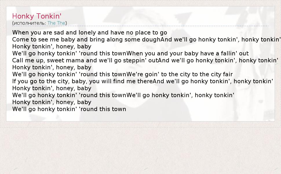 When you are sad and lonely and have no place to go Come to see me baby and bring along some doughAnd we'll go honky tonkin', honky tonkin' Honky tonkin', honey, baby We'll go honky tonkin' 'round this townWhen you and your baby have a fallin' out Call me up, sweet mama and we'll go steppin' outAnd we'll go honky tonkin', honky tonkin' Honky tonkin', honey, baby We'll go honky tonkin' 'round this townWe're goin' to the city to the city fair If you go to the city, baby, you will find me thereAnd we'll go honky tonkin', honky tonkin' Honky tonkin', honey, baby We'll go honky tonkin' 'round this townWe'll go honky tonkin', honky tonkin' Honky tonkin', honey, baby We'll go honky tonkin' 'round this town