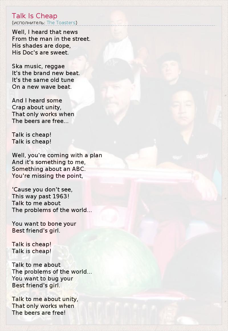 Well, I heard that news From the man in the street. His shades are dope, His Doc's are sweet. Ska music, reggae It's the brand new beat. It's the same old tune On a new wave beat. And I heard some Crap about unity, That only works when The beers are free... Talk is cheap! Talk is cheap! Well, you're coming with a plan And it's something to me, Something about an ABC. You're missing the point, 'Cause you don't see, This way past 1963! Talk to me about The problems of the world... You want to bone your Best friend's girl. Talk is cheap! Talk is cheap! Talk to me about The problems of the world... You want to bug your Best friend's girl. Talk to me about unity, That only works when The beers are free!
