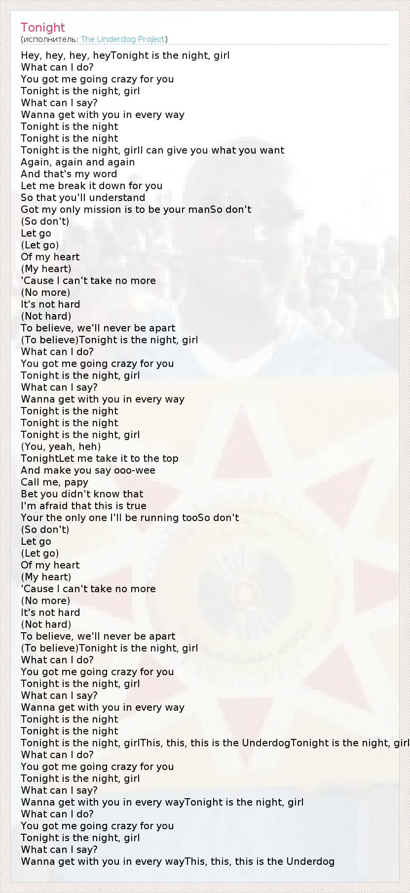 Tonight is the night, girlThis, this, this is the UnderdogTonight is the night, girl