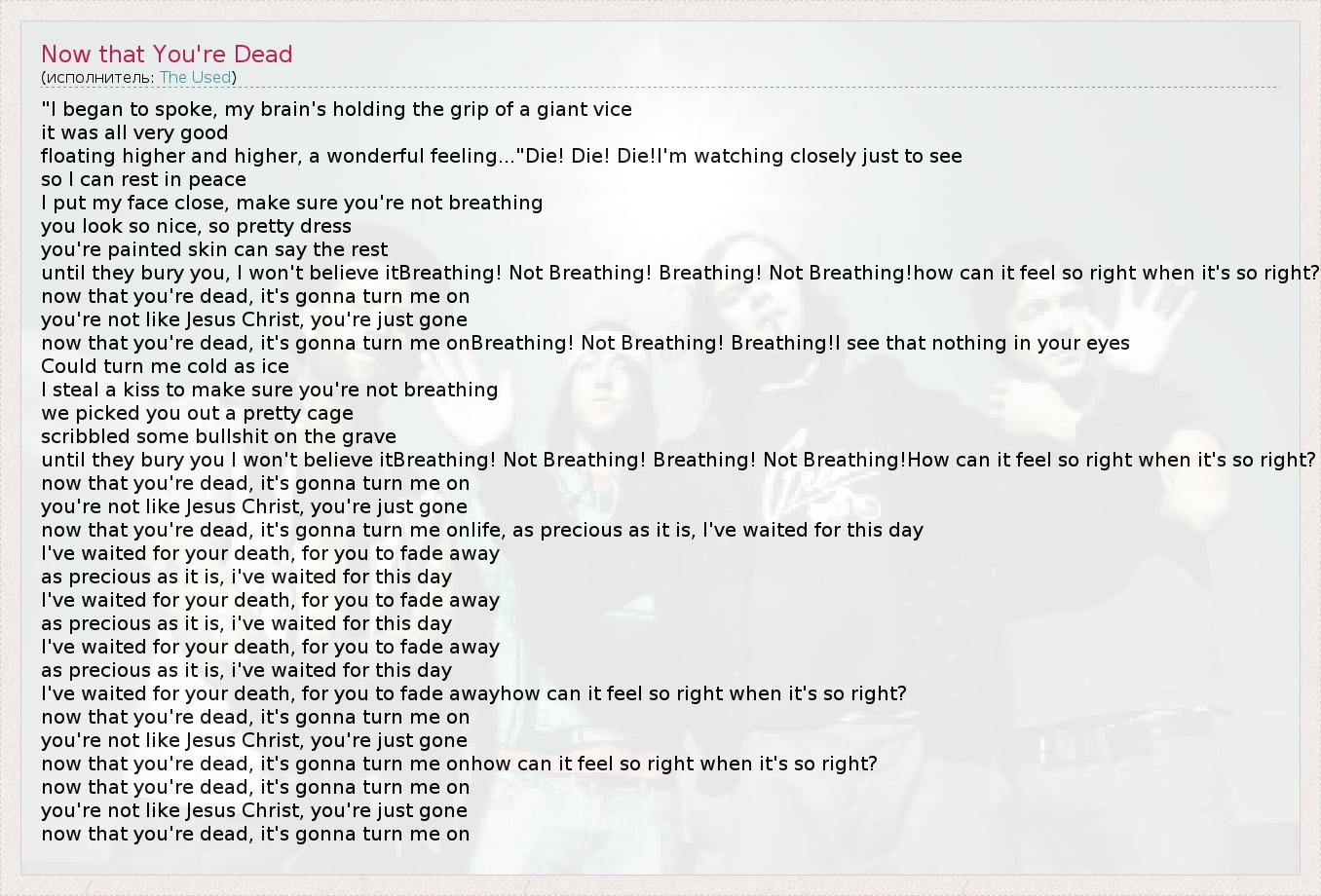 "I began to spoke, my brain's holding the grip of a giant vice it was all very good floating higher and higher, a wonderful feeling..."Die! Die! Die!I'm watching closely just to see so I can rest in peace I put my face close, make sure you're not breathing you look so nice, so pretty dress you're painted skin can say the rest until they bury you, I won't believe itBreathing! Not Breathing! Breathing! Not Breathing!how can it feel so right when it's so right? now that you're dead, it's gonna turn me on you're not like Jesus Christ, you're just gone now that you're dead, it's gonna turn me onBreathing! Not Breathing! Breathing!I see that nothing in your eyes Could turn me cold as ice I steal a kiss to make sure you're not breathing we picked you out a pretty cage scribbled some bullshit on the grave until they bury you I won't believe itBreathing! Not Breathing! Breathing! Not Breathing!How can it feel so right when it's so right? now that you're dead, it's gonna turn me on you're not like Jesus Christ, you're just gone now that you're dead, it's gonna turn me onlife, as precious as it is, I've waited for this day I've waited for your death, for you to fade away as precious as it is, i've waited for this day I've waited for your death, for you to fade away as precious as it is, i've waited for this day I've waited for your death, for you to fade away as precious as it is, i've waited for this day I've waited for your death, for you to fade awayhow can it feel so right when it's so right? now that you're dead, it's gonna turn me on you're not like Jesus Christ, you're just gone now that you're dead, it's gonna turn me onhow can it feel so right when it's so right? now that you're dead, it's gonna turn me on you're not like Jesus Christ, you're just gone now that you're dead, it's gonna turn me on