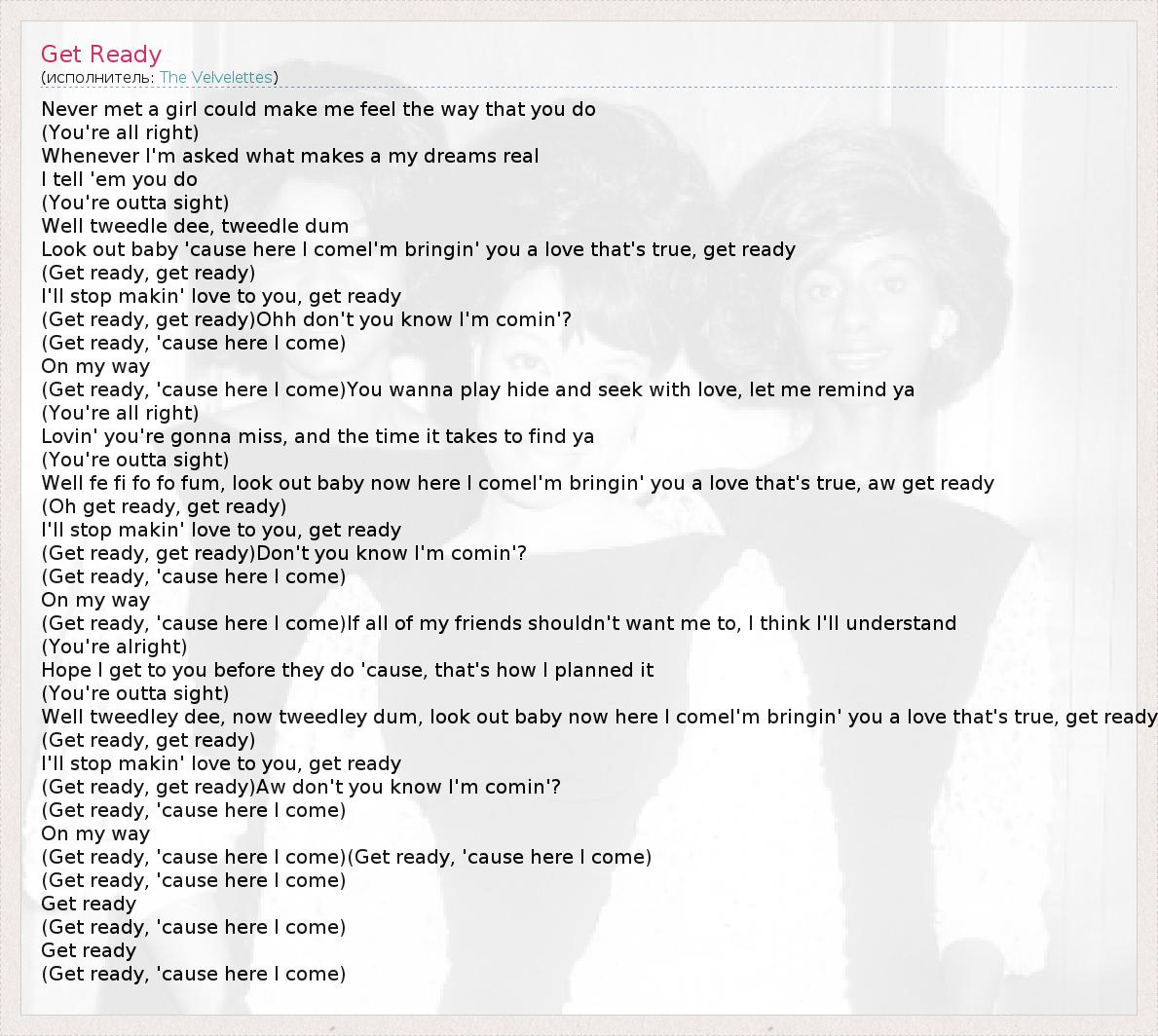 Never met a girl could make me feel the way that you do (You're all right) Whenever I'm asked what makes a my dreams real I tell 'em you do (You're outta sight) Well tweedle dee, tweedle dum Look out baby 'cause here I comeI'm bringin' you a love that's true, get ready (Get ready, get ready) I'll stop makin' love to you, get ready (Get ready, get ready)Ohh don't you know I'm comin'? (Get ready, 'cause here I come) On my way (Get ready, 'cause here I come)You wanna play hide and seek with love, let me remind ya (You're all right) Lovin' you're gonna miss, and the time it takes to find ya (You're outta sight) Well fe fi fo fo fum, look out baby now here I comeI'm bringin' you a love that's true, aw get ready (Oh get ready, get ready) I'll stop makin' love to you, get ready (Get ready, get ready)Don't you know I'm comin'? (Get ready, 'cause here I come) On my way (Get ready, 'cause here I come)If all of my friends shouldn't want me to, I think I'll understand (You're alright) Hope I get to you before they do 'cause, that's how I planned it (You're outta sight) Well tweedley dee, now tweedley dum, look out baby now here I comeI'm bringin' you a love that's true, get ready (Get ready, get ready) I'll stop makin' love to you, get ready (Get ready, get ready)Aw don't you know I'm comin'? (Get ready, 'cause here I come) On my way (Get ready, 'cause here I come)(Get ready, 'cause here I come) (Get ready, 'cause here I come) Get ready (Get ready, 'cause here I come) Get ready (Get ready, 'cause here I come)