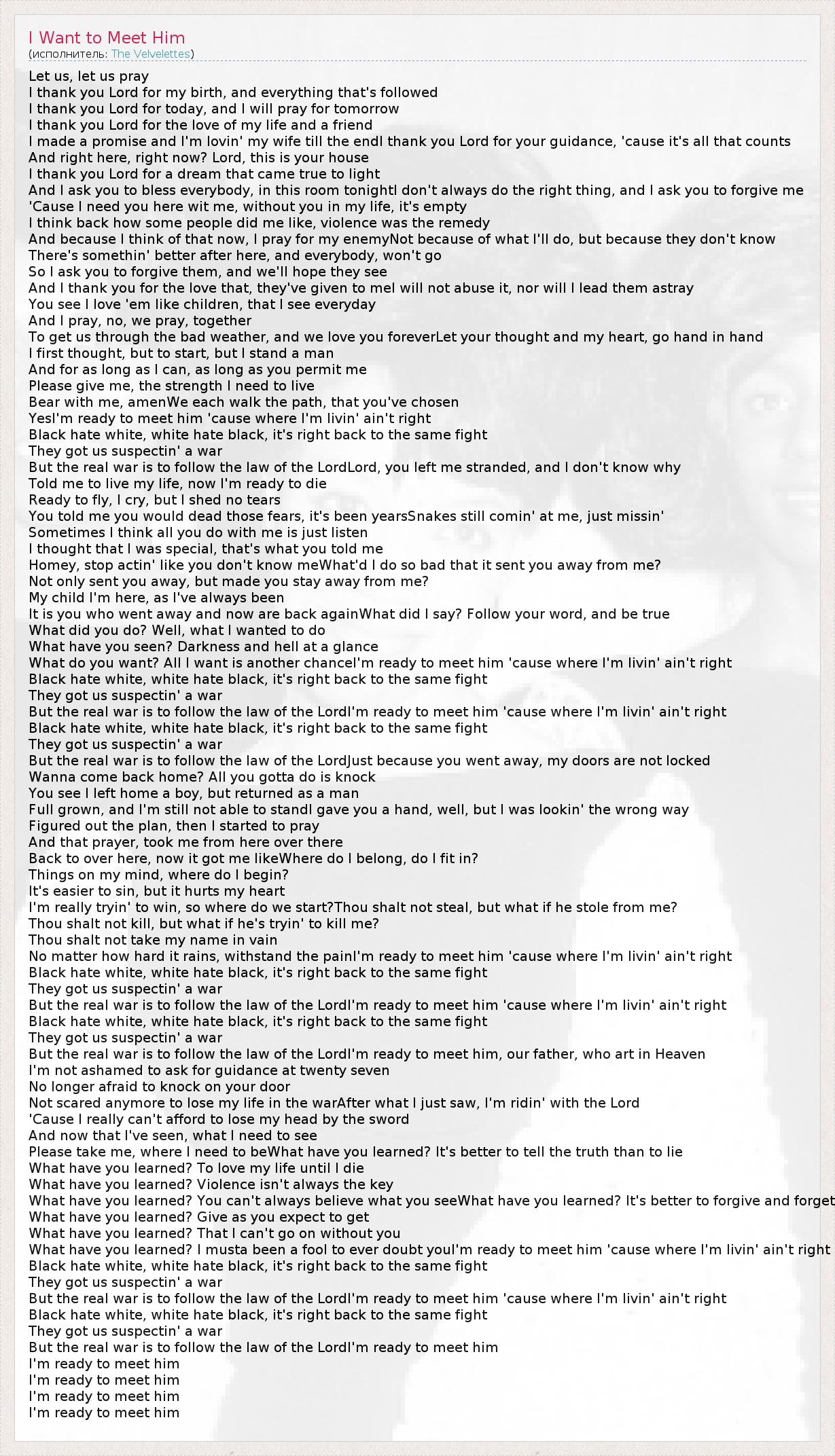 Let us, let us pray I thank you Lord for my birth, and everything that's followed I thank you Lord for today, and I will pray for tomorrow I thank you Lord for the love of my life and a friend I made a promise and I'm lovin' my wife till the endI thank you Lord for your guidance, 'cause it's all that counts And right here, right now? Lord, this is your house I thank you Lord for a dream that came true to light And I ask you to bless everybody, in this room tonightI don't always do the right thing, and I ask you to forgive me 'Cause I need you here wit me, without you in my life, it's empty I think back how some people did me like, violence was the remedy And because I think of that now, I pray for my enemyNot because of what I'll do, but because they don't know There's somethin' better after here, and everybody, won't go So I ask you to forgive them, and we'll hope they see And I thank you for the love that, they've given to meI will not abuse it, nor will I lead them astray You see I love 'em like children, that I see everyday And I pray, no, we pray, together To get us through the bad weather, and we love you foreverLet your thought and my heart, go hand in hand I first thought, but to start, but I stand a man And for as long as I can, as long as you permit me Please give me, the strength I need to live Bear with me, amenWe each walk the path, that you've chosen YesI'm ready to meet him 'cause where I'm livin' ain't right Black hate white, white hate black, it's right back to the same fight They got us suspectin' a war But the real war is to follow the law of the LordLord, you left me stranded, and I don't know why Told me to live my life, now I'm ready to die Ready to fly, I cry, but I shed no tears You told me you would dead those fears, it's been yearsSnakes still comin' at me, just missin' Sometimes I think all you do with me is just listen I thought that I was special, that's what you told me Homey, stop actin' like you don't know meWhat'd I do so bad that it sent you away from me? Not only sent you away, but made you stay away from me? My child I'm here, as I've always been It is you who went away and now are back againWhat did I say? Follow your word, and be true What did you do? Well, what I wanted to do What have you seen? Darkness and hell at a glance What do you want? All I want is another chanceI'm ready to meet him 'cause where I'm livin' ain't right Black hate white, white hate black, it's right back to the same fight They got us suspectin' a war But the real war is to follow the law of the LordI'm ready to meet him 'cause where I'm livin' ain't right Black hate white, white hate black, it's right back to the same fight They got us suspectin' a war But the real war is to follow the law of the LordJust because you went away, my doors are not locked Wanna come back home? All you gotta do is knock You see I left home a boy, but returned as a man Full grown, and I'm still not able to standI gave you a hand, well, but I was lookin' the wrong way Figured out the plan, then I started to pray And that prayer, took me from here over there Back to over here, now it got me likeWhere do I belong, do I fit in? Things on my mind, where do I begin? It's easier to sin, but it hurts my heart I'm really tryin' to win, so where do we start?Thou shalt not steal, but what if he stole from me? Thou shalt not kill, but what if he's tryin' to kill me? Thou shalt not take my name in vain No matter how hard it rains, withstand the painI'm ready to meet him 'cause where I'm livin' ain't right Black hate white, white hate black, it's right back to the same fight They got us suspectin' a war But the real war is to follow the law of the LordI'm ready to meet him 'cause where I'm livin' ain't right Black hate white, white hate black, it's right back to the same fight They got us suspectin' a war But the real war is to follow the law of the LordI'm ready to meet him, our father, who art in Heaven I'm not ashamed to ask for guidance at twenty seven No longer afraid to knock on your door Not scared anymore to lose my life in the warAfter what I just saw, I'm ridin' with the Lord 'Cause I really can't afford to lose my head by the sword And now that I've seen, what I need to see Please take me, where I need to beWhat have you learned? It's better to tell the truth than to lie What have you learned? To love my life until I die What have you learned? Violence isn't always the key What have you learned? You can't always believe what you seeWhat have you learned? It's better to forgive and forget What have you learned? Give as you expect to get What have you learned? That I can't go on without you What have you learned? I musta been a fool to ever doubt youI'm ready to meet him 'cause where I'm livin' ain't right Black hate white, white hate black, it's right back to the same fight They got us suspectin' a war But the real war is to follow the law of the LordI'm ready to meet him 'cause where I'm livin' ain't right Black hate white, white hate black, it's right back to the same fight They got us suspectin' a war But the real war is to follow the law of the LordI'm ready to meet him I'm ready to meet him I'm ready to meet him I'm ready to meet him I'm ready to meet him