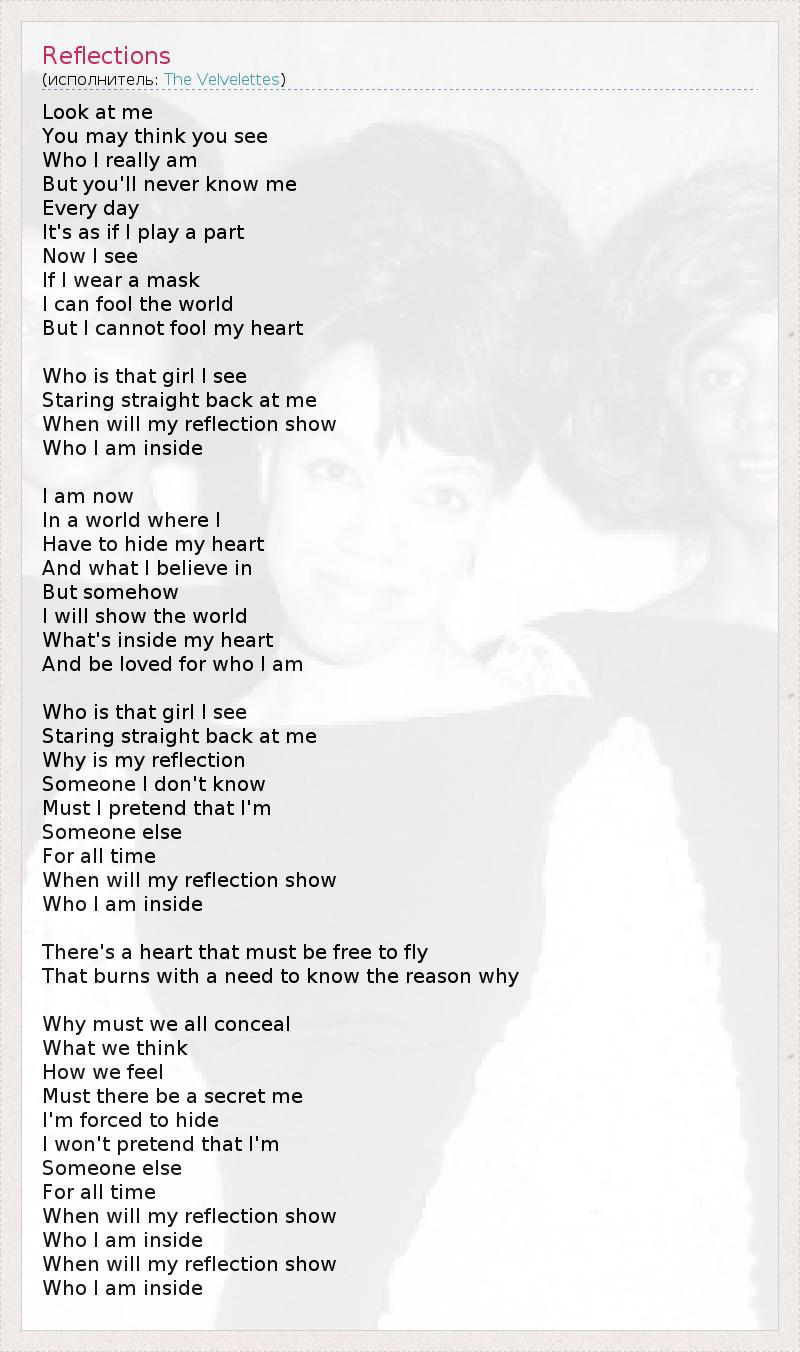 Посмотри на меня ты можешь думать,что видишь меня настоящую но ты никогда не узнаешь меня каждый день это часть моей игры сейчас я вижу,что если ношу маску то я могу обманывать мир,но я не могу обманывать свое сердце Кто та девочка,стоящая прямо за моей спиной, когда мое отражение покажет кто я внутри Я сейчас в мире,где должна прятать свое сердце и верю в то,что как-нибудь я покажу миру,что находится у меня в сердце и люблю то кем я являюсь Кто та девочка,стоящая прямо за моей спиной почему в моем отражении кто-то кого я не знала может я притворялась кем-то другим все это время когда мое отражение покажет кто я внутри Там сердце,котрое должно быть свободно к полету которое горит от необходимости знать причину почему почему мы все должны скрывать то,что думаем что чувствуем должна быть секретность я вынуждена прятаться Я притворялась,что я кто-то другой все это время когда мое отражение покажет кто я внутри когда мое отражение покажет кто я внутри