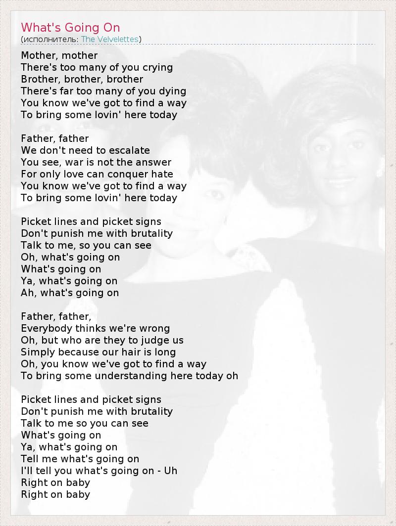 Mother, mother There's too many of you crying Brother, brother, brother There's far too many of you dying You know we've got to find a way To bring some lovin' here today Father, father We don't need to escalate You see, war is not the answer For only love can conquer hate You know we've got to find a way To bring some lovin' here today Picket lines and picket signs Don't punish me with brutality Talk to me, so you can see Oh, what's going on What's going on Ya, what's going on Ah, what's going on Father, father, Everybody thinks we're wrong Oh, but who are they to judge us Simply because our hair is long Oh, you know we've got to find a way To bring some understanding here today oh Picket lines and picket signs Don't punish me with brutality Talk to me so you can see What's going on Ya, what's going on Tell me what's going on I'll tell you what's going on - Uh Right on baby Right on baby