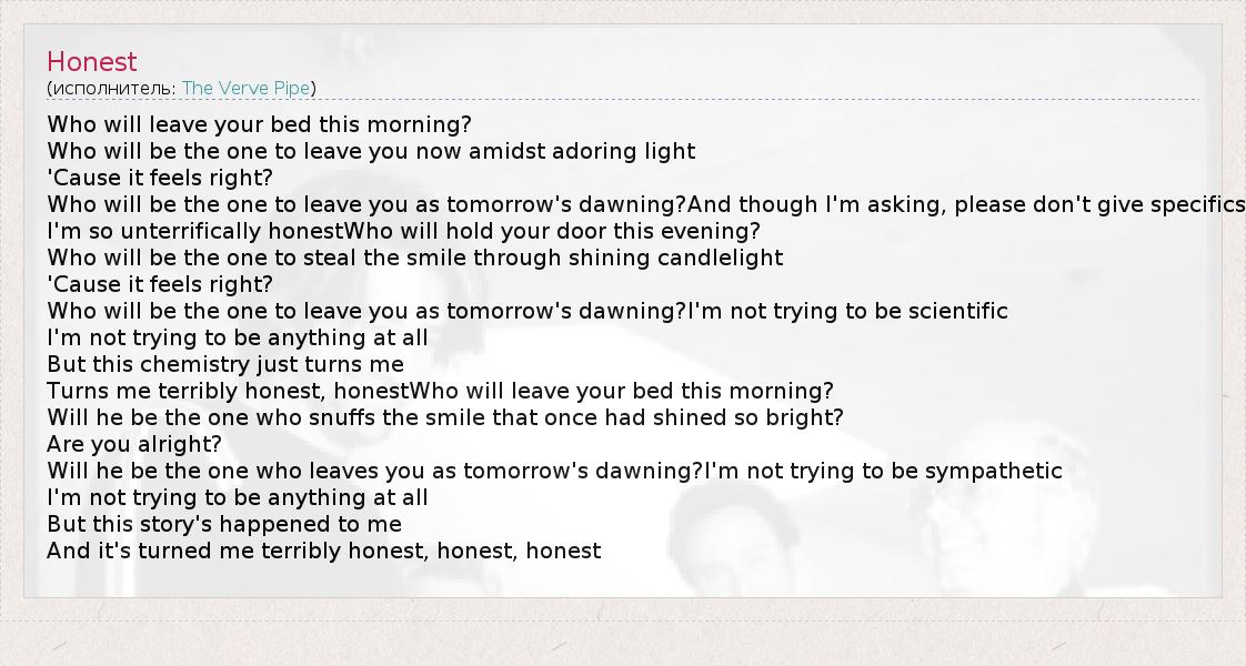 Turns me terribly honest, honestWho will leave your bed this morning?