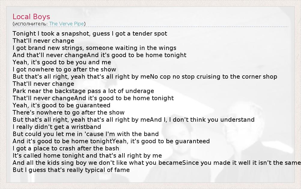Tonight I took a snapshot, guess I got a tender spot That'll never change I got brand new strings, someone waiting in the wings And that'll never changeAnd it's good to be home tonight Yeah, it's good to be you and me I got nowhere to go after the show But that's all right, yeah that's all right by meNo cop no stop cruising to the corner shop That'll never change Park near the backstage pass a lot of underage That'll never changeAnd it's good to be home tonight Yeah, it's good to be guaranteed There's nowhere to go after the show But that's all right, yeah that's all right by meAnd I, I don't think you understand I really didn't get a wristband But could you let me in 'cause I'm with the band And it's good to be home tonightYeah, it's good to be guaranteed I got a place to crash after the bash It's called home tonight and that's all right by me And all the kids sing boy we don't like what you becameSince you made it well it isn't the same But I guess that's really typical of fame