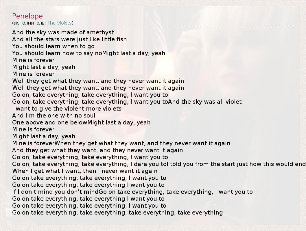 Go on, take everything, take everything, I want you toAnd the sky was all violet