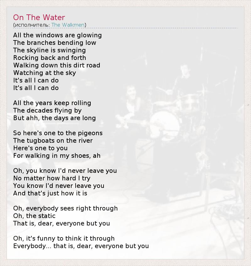 All the windows are glowing The branches bending low The skyline is swinging Rocking back and forth Walking down this dirt road Watching at the sky It's all I can do It's all I can do All the years keep rolling The decades flying by But ahh, the days are long So here's one to the pigeons The tugboats on the river Here's one to you For walking in my shoes, ah Oh, you know I'd never leave you No matter how hard I try You know I'd never leave you And that's just how it is Oh, everybody sees right through Oh, the static That is, dear, everyone but you Oh, it's funny to think it through Everybody... that is, dear, everyone but you
