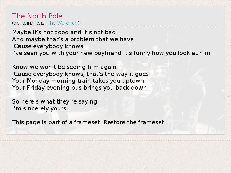 Maybe it's not good and it's not bad And maybe that's a problem that we have 'Cause everybody knows I've seen you with your new boyfriend it's funny how you look at him I Know we won't be seeing him again 'Cause everybody knows, that's the way it goes Your Monday morning train takes you uptown Your Friday evening bus brings you back down So here's what they're saying I'm sincerely yours. This page is part of a frameset. Restore the frameset