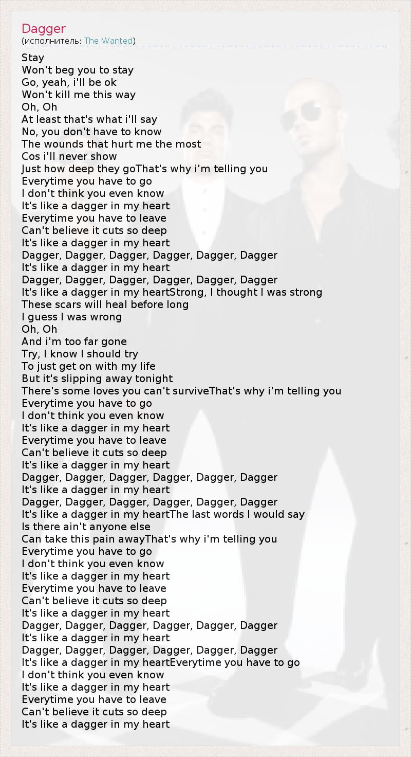 Stay Won't beg you to stay Go, yeah, i'll be ok Won't kill me this way Oh, Oh At least that's what i'll say No, you don't have to know The wounds that hurt me the most Cos i'll never show Just how deep they goThat's why i'm telling you Everytime you have to go I don't think you even know It's like a dagger in my heart Everytime you have to leave Can't believe it cuts so deep It's like a dagger in my heart Dagger, Dagger, Dagger, Dagger, Dagger, Dagger It's like a dagger in my heart Dagger, Dagger, Dagger, Dagger, Dagger, Dagger It's like a dagger in my heartStrong, I thought I was strong These scars will heal before long I guess I was wrong Oh, Oh And i'm too far gone Try, I know I should try To just get on with my life But it's slipping away tonight There's some loves you can't surviveThat's why i'm telling you Everytime you have to go I don't think you even know It's like a dagger in my heart Everytime you have to leave Can't believe it cuts so deep It's like a dagger in my heart Dagger, Dagger, Dagger, Dagger, Dagger, Dagger It's like a dagger in my heart Dagger, Dagger, Dagger, Dagger, Dagger, Dagger It's like a dagger in my heartThe last words I would say Is there ain't anyone else Can take this pain awayThat's why i'm telling you Everytime you have to go I don't think you even know It's like a dagger in my heart Everytime you have to leave Can't believe it cuts so deep It's like a dagger in my heart Dagger, Dagger, Dagger, Dagger, Dagger, Dagger It's like a dagger in my heart Dagger, Dagger, Dagger, Dagger, Dagger, Dagger It's like a dagger in my heartEverytime you have to go I don't think you even know It's like a dagger in my heart Everytime you have to leave Can't believe it cuts so deep It's like a dagger in my heart