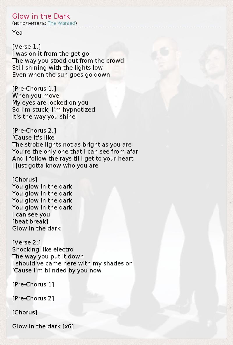 Yea [Verse 1:] I was on it from the get go The way you stood out from the crowd Still shining with the lights low Even when the sun goes go down [Pre-Chorus 1:] When you move My eyes are locked on you So I'm stuck, I'm hypnotized It's the way you shine [Pre-Chorus 2:] ‘Cause it's like The strobe lights not as bright as you are You're the only one that I can see from afar And I follow the rays til I get to your heart I just gotta know who you are [Chorus] You glow in the dark You glow in the dark You glow in the dark You glow in the dark I can see you [beat break] Glow in the dark [Verse 2:] Shocking like electro The way you put it down I should've came here with my shades on ‘Cause I'm blinded by you now [Pre-Chorus 1] [Pre-Chorus 2] [Chorus] Glow in the dark [x6]