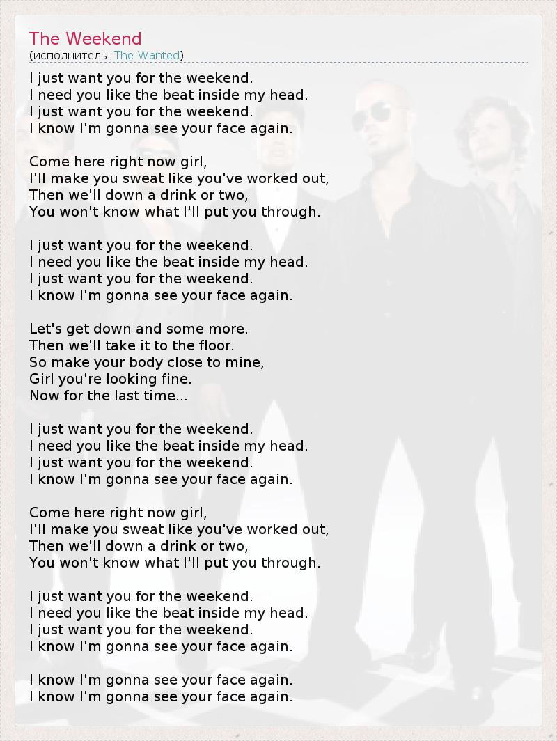 I just want you for the weekend. I need you like the beat inside my head. I just want you for the weekend. I know I'm gonna see your face again. Come here right now girl, I'll make you sweat like you've worked out, Then we'll down a drink or two, You won't know what I'll put you through. I just want you for the weekend. I need you like the beat inside my head. I just want you for the weekend. I know I'm gonna see your face again. Let's get down and some more. Then we'll take it to the floor. So make your body close to mine, Girl you're looking fine. Now for the last time... I just want you for the weekend. I need you like the beat inside my head. I just want you for the weekend. I know I'm gonna see your face again. Come here right now girl, I'll make you sweat like you've worked out, Then we'll down a drink or two, You won't know what I'll put you through. I just want you for the weekend. I need you like the beat inside my head. I just want you for the weekend. I know I'm gonna see your face again. I know I'm gonna see your face again. I know I'm gonna see your face again.