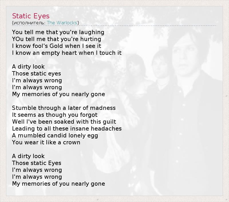 You tell me that you're laughing YOu tell me that you're hurting I know fool's Gold when I see it I know an empty heart when I touch it A dirty look Those static eyes I'm always wrong I'm always wrong My memories of you nearly gone Stumble through a later of madness It seems as though you forgot Well I've been soaked with this guilt Leading to all these insane headaches A mumbled candid lonely egg You wear it like a crown A dirty look Those static Eyes I'm always wrong I'm always wrong My memories of you nearly gone