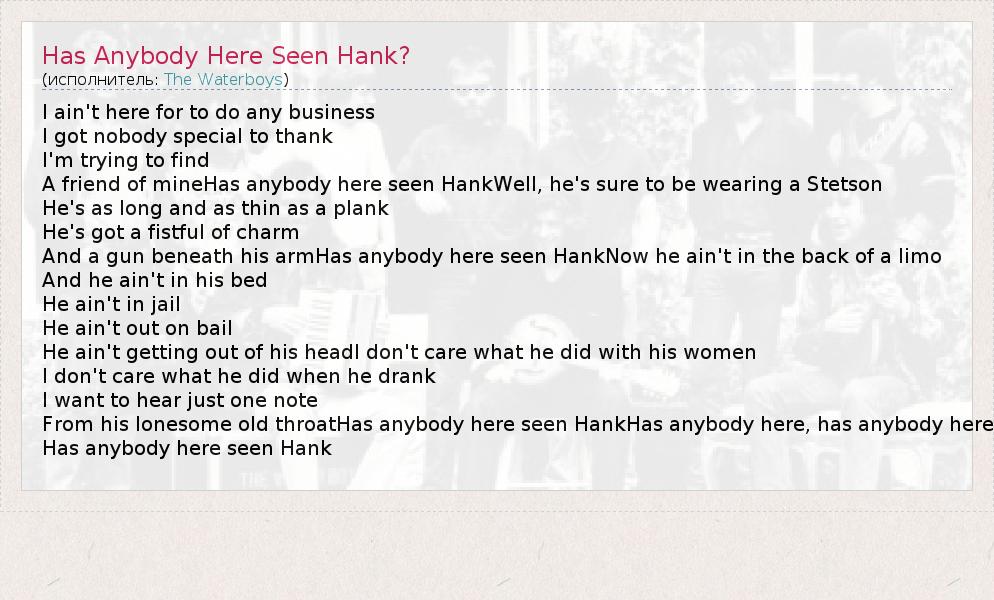 А как ты думаешь, о чем песня "Has Anybody Here Seen Hank?" ?