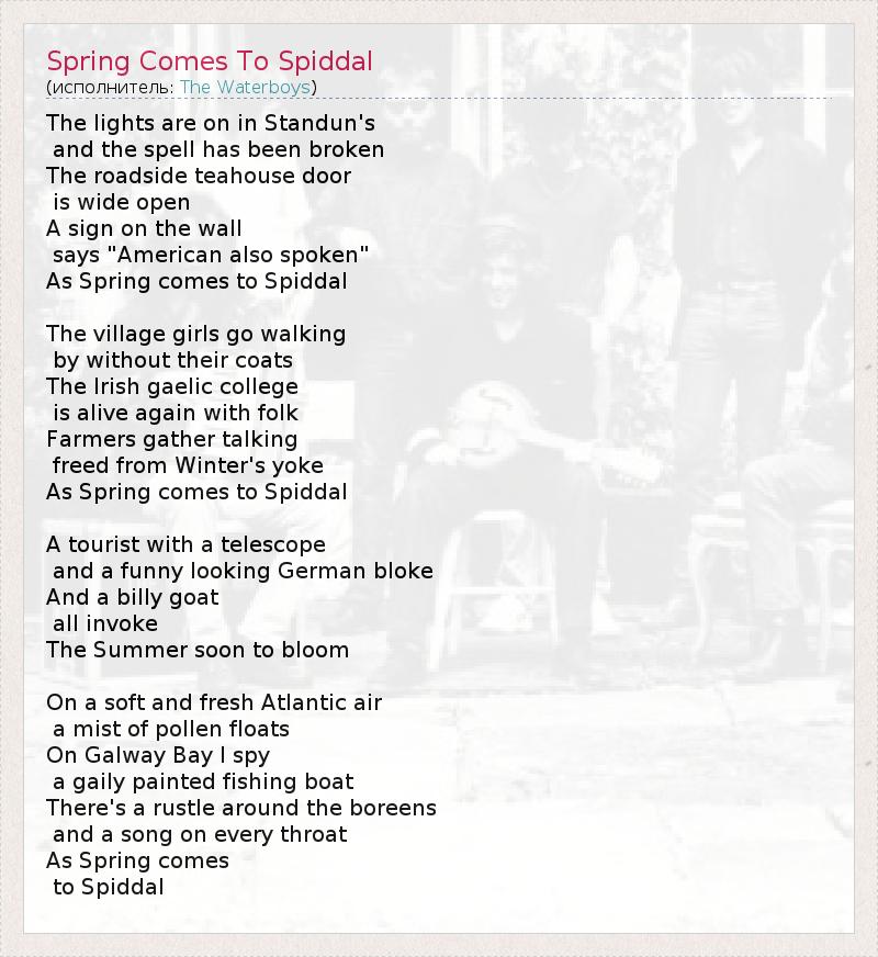 А как ты думаешь, о чем песня "Spring Comes To Spiddal" ?
