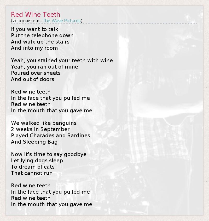 If you want to talk Put the telephone down And walk up the stairs And into my room Yeah, you stained your teeth with wine Yeah, you ran out of mine Poured over sheets And out of doors Red wine teeth In the face that you pulled me Red wine teeth In the mouth that you gave me We walked like penguins 2 weeks in September Played Charades and Sardines And Sleeping Bag Now it's time to say goodbye Let lying dogs sleep To dream of cats That cannot run Red wine teeth In the face that you pulled me Red wine teeth In the mouth that you gave me