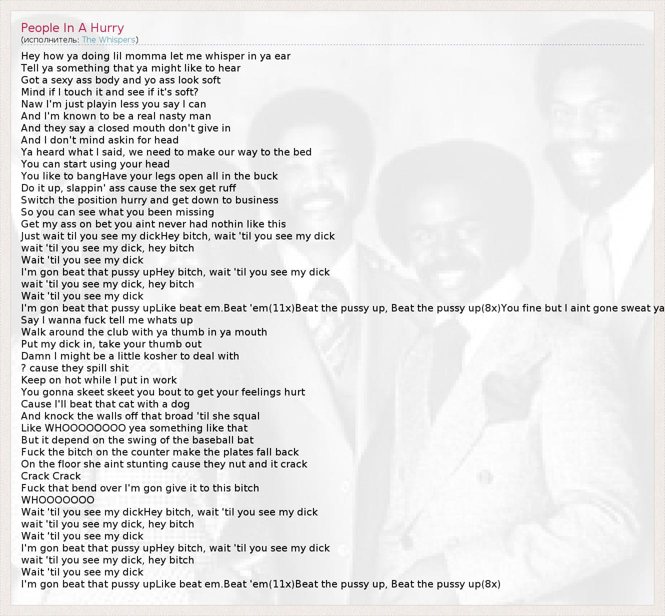 Hey how ya doing lil momma let me whisper in ya ear Tell ya something that ya might like to hear Got a sexy ass body and yo ass look soft Mind if I touch it and see if it's soft? Naw I'm just playin less you say I can And I'm known to be a real nasty man And they say a closed mouth don't give in And I don't mind askin for head Ya heard what I said, we need to make our way to the bed You can start using your head You like to bangHave your legs open all in the buck Do it up, slappin' ass cause the sex get ruff Switch the position hurry and get down to business So you can see what you been missing Get my ass on bet you aint never had nothin like this Just wait til you see my dickHey bitch, wait 'til you see my dick wait 'til you see my dick, hey bitch Wait 'til you see my dick I'm gon beat that pussy upHey bitch, wait 'til you see my dick wait 'til you see my dick, hey bitch Wait 'til you see my dick I'm gon beat that pussy upLike beat em.Beat 'em(11x)Beat the pussy up, Beat the pussy up(8x)You fine but I aint gone sweat ya Say I wanna fuck tell me whats up Walk around the club with ya thumb in ya mouth Put my dick in, take your thumb out Damn I might be a little kosher to deal with ? cause they spill shit Keep on hot while I put in work You gonna skeet skeet you bout to get your feelings hurt Cause I'll beat that cat with a dog And knock the walls off that broad 'til she squal Like WHOOOOOOOO yea something like that But it depend on the swing of the baseball bat Fuck the bitch on the counter make the plates fall back On the floor she aint stunting cause they nut and it crack Crack Crack Fuck that bend over I'm gon give it to this bitch WHOOOOOOO Wait 'til you see my dickHey bitch, wait 'til you see my dick wait 'til you see my dick, hey bitch Wait 'til you see my dick I'm gon beat that pussy upHey bitch, wait 'til you see my dick wait 'til you see my dick, hey bitch Wait 'til you see my dick I'm gon beat that pussy upLike beat em.Beat 'em(11x)Beat the pussy up, Beat the pussy up(8x)