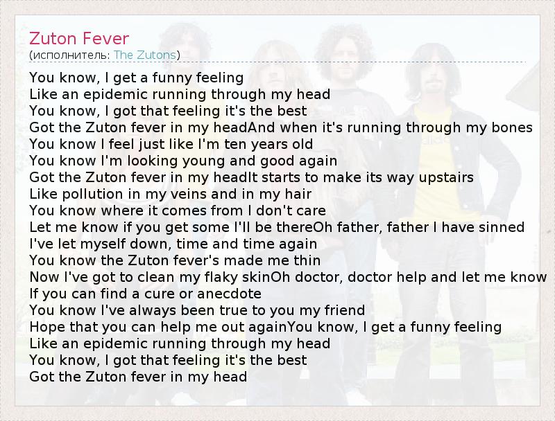 You know, I get a funny feeling Like an epidemic running through my head You know, I got that feeling it's the best Got the Zuton fever in my headAnd when it's running through my bones You know I feel just like I'm ten years old You know I'm looking young and good again Got the Zuton fever in my headIt starts to make its way upstairs Like pollution in my veins and in my hair You know where it comes from I don't care Let me know if you get some I'll be thereOh father, father I have sinned I've let myself down, time and time again You know the Zuton fever's made me thin Now I've got to clean my flaky skinOh doctor, doctor help and let me know If you can find a cure or anecdote You know I've always been true to you my friend Hope that you can help me out againYou know, I get a funny feeling Like an epidemic running through my head You know, I got that feeling it's the best Got the Zuton fever in my head