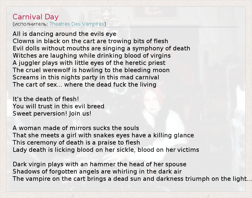 Все танцуют вокруг ока зла, Чёрные клоуны с тележек бросают куски плоти, Зловещие куклы без уст поют симфонию смерти, Ведьмы смеются, вкушая кровь девственниц, Жонглёр забавляется с маленькими глазками еретика-священника, Ужасный оборотень воет на кровавую луну. Раздаются крики на этой ночной вечеринке, на этом безумном карнавале, В телеге похоти... мёртвые совокупляются с живыми. Это – смерть плоти! Доверься этому злобному роду, Сладкому извращению... Присоединяйся к нам! Женщина, из зеркал сотворённая, высасывает души Из встречных ею, у девочки со змеиными глазами смертоносный взгляд. Этот обряд смерти – восхваление плоти, И Леди Смерть слизывает кровь со своего серпа, кровь своих жертв. Мрачная дева играется с молотом с головой своего мужа, Тени позабытых ангелов кружатся в тёмном воздухе, Вампиры на тележке прикатывают мёртвое солнце, и мрак празднует свой триумф над светом.
