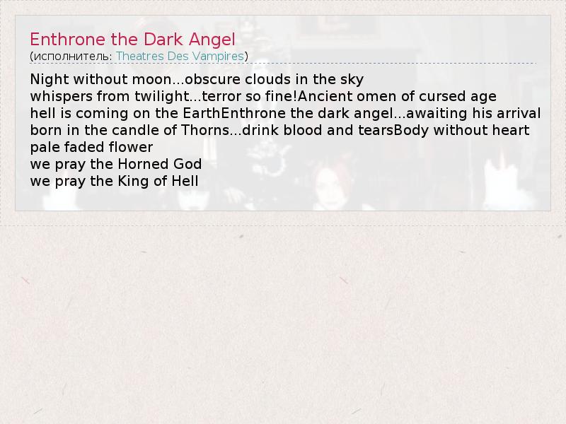 А как ты думаешь, о чем песня "Enthrone the Dark Angel" ?