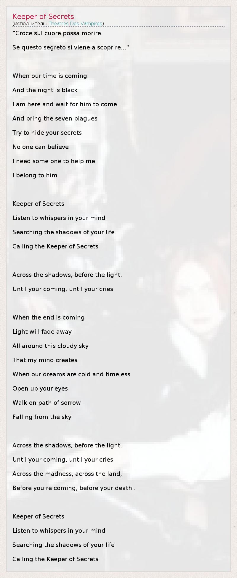 "Croce sul cuore possa morire Se questo segreto si viene a scoprire..." When our time is coming And the night is black I am here and wait for him to come And bring the seven plagues Try to hide your secrets No one can believe I need some one to help me I belong to him Keeper of Secrets Listen to whispers in your mind Searching the shadows of your life Calling the Keeper of Secrets Across the shadows, before the light.. Until your coming, until your cries When the end is coming Light will fade away All around this cloudy sky That my mind creates When our dreams are cold and timeless Open up your eyes Walk on path of sorrow Falling from the sky Across the shadows, before the light.. Until your coming, until your cries Across the madness, across the land, Before you're coming, before your death.. Keeper of Secrets Listen to whispers in your mind Searching the shadows of your life Calling the Keeper of Secrets