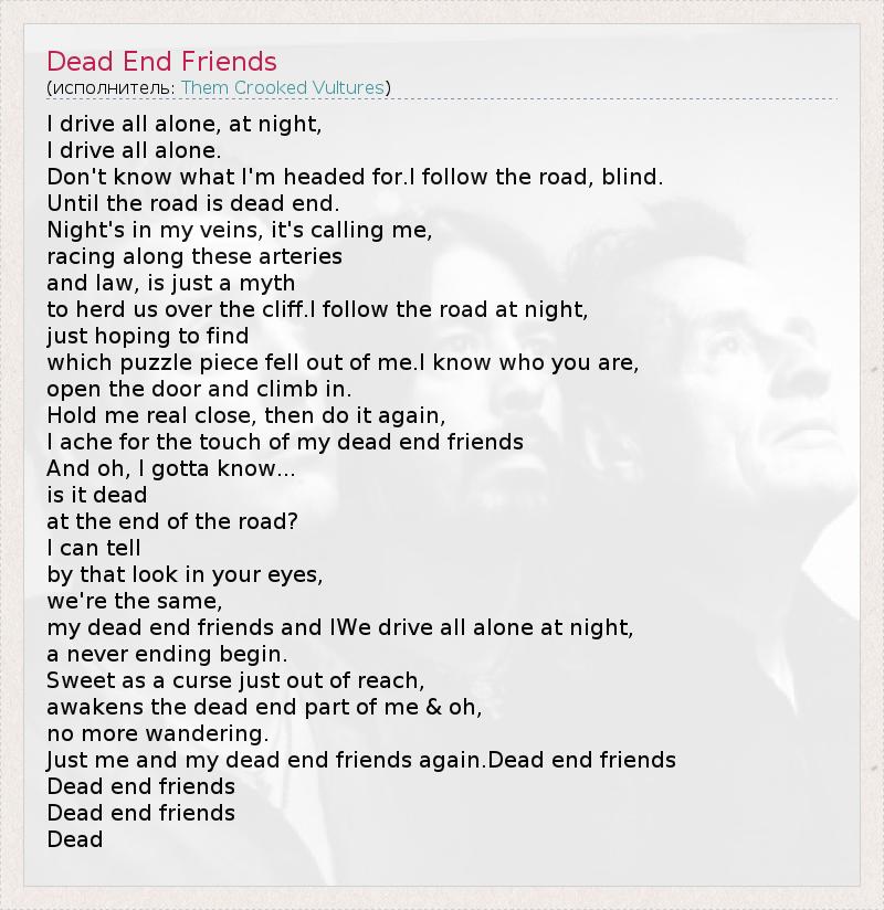 I drive all alone, at night, I drive all alone. Don't know what I'm headed for.I follow the road, blind. Until the road is dead end. Night's in my veins, it's calling me, racing along these arteries and law, is just a myth to herd us over the cliff.I follow the road at night, just hoping to find which puzzle piece fell out of me.I know who you are, open the door and climb in. Hold me real close, then do it again, I ache for the touch of my dead end friends And oh, I gotta know... is it dead at the end of the road? I can tell by that look in your eyes, we're the same, my dead end friends and IWe drive all alone at night, a never ending begin. Sweet as a curse just out of reach, awakens the dead end part of me & oh, no more wandering. Just me and my dead end friends again.Dead end friends Dead end friends Dead end friends Dead