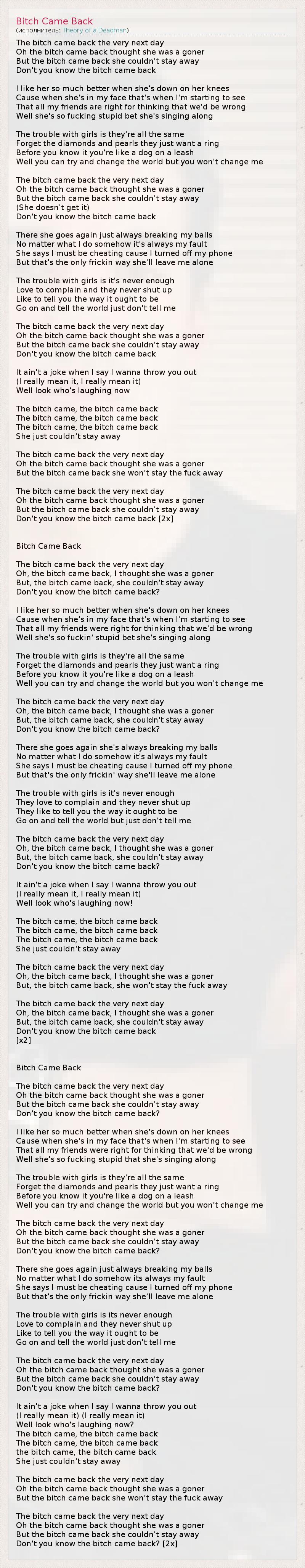 The bitch came back the very next day Oh the bitch came back thought she was a goner But the bitch came back she couldn't stay away Don't you know the bitch came back I like her so much better when she's down on her knees Cause when she's in my face that's when I'm starting to see That all my friends are right for thinking that we'd be wrong Well she's so fucking stupid bet she's singing along The trouble with girls is they're all the same Forget the diamonds and pearls they just want a ring Before you know it you're like a dog on a leash Well you can try and change the world but you won't change me The bitch came back the very next day Oh the bitch came back thought she was a goner But the bitch came back she couldn't stay away (She doesn't get it) Don't you know the bitch came back There she goes again just always breaking my balls No matter what I do somehow it's always my fault She says I must be cheating cause I turned off my phone But that's the only frickin way she'll leave me alone The trouble with girls is it's never enough Love to complain and they never shut up Like to tell you the way it ought to be Go on and tell the world just don't tell me The bitch came back the very next day Oh the bitch came back thought she was a goner But the bitch came back she couldn't stay away Don't you know the bitch came back It ain't a joke when I say I wanna throw you out (I really mean it, I really mean it) Well look who's laughing now The bitch came, the bitch came back The bitch came, the bitch came back The bitch came, the bitch came back She just couldn't stay away The bitch came back the very next day Oh the bitch came back thought she was a goner But the bitch came back she won't stay the fuck away The bitch came back the very next day Oh the bitch came back thought she was a goner But the bitch came back she couldn't stay away Don't you know the bitch came back [2x] Bitch Came Back The bitch came back the very next day Oh, the bitch came back, I thought she was a goner But, the bitch came back, she couldn't stay away Don't you know the bitch came back? I like her so much better when she's down on her knees Cause when she's in my face that's when I'm starting to see That all my friends were right for thinking that we'd be wrong Well she's so fuckin' stupid bet she's singing along The trouble with girls is they're all the same Forget the diamonds and pearls they just want a ring Before you know it you're like a dog on a leash Well you can try and change the world but you won't change me The bitch came back the very next day Oh, the bitch came back, I thought she was a goner But, the bitch came back, she couldn't stay away Don't you know the bitch came back? There she goes again she's always breaking my balls No matter what I do somehow it's always my fault She says I must be cheating cause I turned off my phone But that's the only frickin' way she'll leave me alone The trouble with girls is it's never enough They love to complain and they never shut up They like to tell you the way it ought to be Go on and tell the world but just don't tell me The bitch came back the very next day Oh, the bitch came back, I thought she was a goner But, the bitch came back, she couldn't stay away Don't you know the bitch came back? It ain't a joke when I say I wanna throw you out (I really mean it, I really mean it) Well look who's laughing now! The bitch came, the bitch came back The bitch came, the bitch came back The bitch came, the bitch came back She just couldn't stay away The bitch came back the very next day Oh, the bitch came back, I thought she was a goner But, the bitch came back, she won't stay the fuck away The bitch came back the very next day Oh, the bitch came back, I thought she was a goner But, the bitch came back, she couldn't stay away Don't you know the bitch came back [x2] Bitch Came Back The bitch came back the very next day Oh the bitch came back thought she was a goner But the bitch came back she couldn't stay away Don't you know the bitch came back? I like her so much better when she's down on her knees Cause when she's in my face that's when I'm starting to see That all my friends were right for thinking that we'd be wrong Well she's so fucking stupid that she's singing along The trouble with girls is they're all the same Forget the diamonds and pearls they just want a ring Before you know it you're like a dog on a leash Well you can try and change the world but you won't change me The bitch came back the very next day Oh the bitch came back thought she was a goner But the bitch came back she couldn't stay away Don't you know the bitch came back? There she goes again just always breaking my balls No matter what I do somehow its always my fault She says I must be cheating cause I turned off my phone But that's the only frickin way she'll leave me alone The trouble with girls is its never enough Love to complain and they never shut up Like to tell you the way it ought to be Go on and tell the world just don't tell me The bitch came back the very next day Oh the bitch came back thought she was a goner But the bitch came back she couldn't stay away Don't you know the bitch came back? It ain't a joke when I say I wanna throw you out (I really mean it) (I really mean it) Well look who's laughing now? The bitch came, the bitch came back The bitch came, the bitch came back the bitch came, the bitch came back She just couldn't stay away The bitch came back the very next day Oh the bitch came back thought she was a goner But the bitch came back she won't stay the fuck away The bitch came back the very next day Oh the bitch came back thought she was a goner But the bitch came back she couldn't stay away Don't you know the bitch came back? [2x]