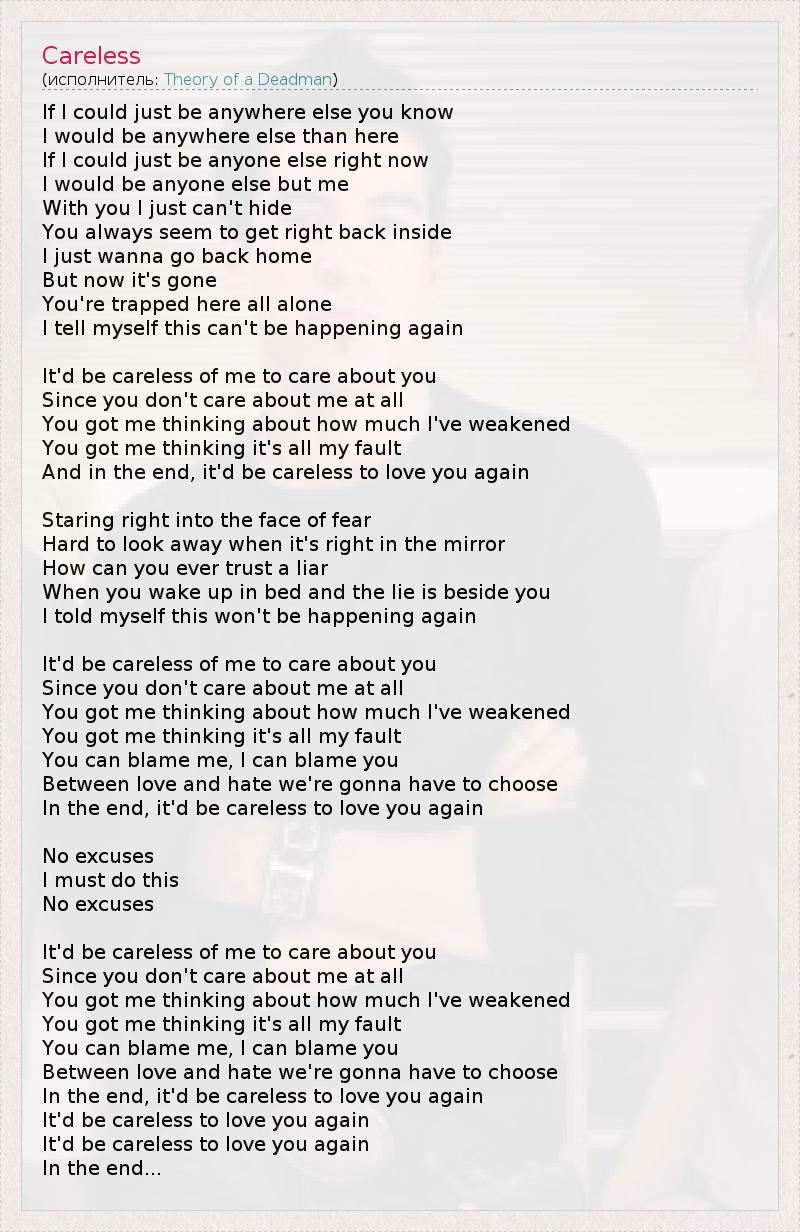 If I could just be anywhere else you know I would be anywhere else than here If I could just be anyone else right now I would be anyone else but me With you I just can't hide You always seem to get right back inside I just wanna go back home But now it's gone You're trapped here all alone I tell myself this can't be happening again It'd be careless of me to care about you Since you don't care about me at all You got me thinking about how much I've weakened You got me thinking it's all my fault And in the end, it'd be careless to love you again Staring right into the face of fear Hard to look away when it's right in the mirror How can you ever trust a liar When you wake up in bed and the lie is beside you I told myself this won't be happening again It'd be careless of me to care about you Since you don't care about me at all You got me thinking about how much I've weakened You got me thinking it's all my fault You can blame me, I can blame you Between love and hate we're gonna have to choose In the end, it'd be careless to love you again No excuses I must do this No excuses It'd be careless of me to care about you Since you don't care about me at all You got me thinking about how much I've weakened You got me thinking it's all my fault You can blame me, I can blame you Between love and hate we're gonna have to choose In the end, it'd be careless to love you again It'd be careless to love you again It'd be careless to love you again In the end...