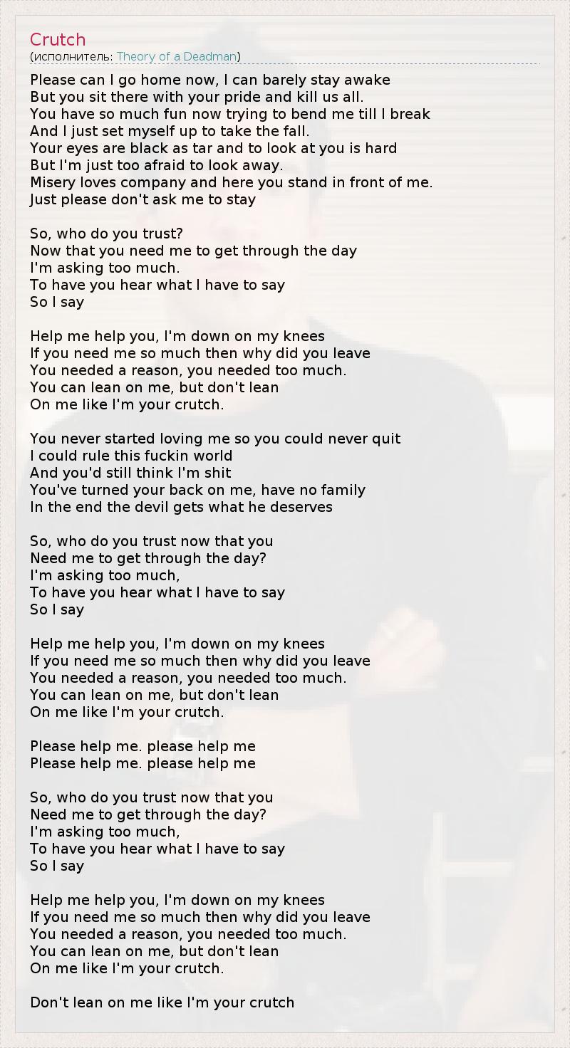 Please can I go home now, I can barely stay awake But you sit there with your pride and kill us all. You have so much fun now trying to bend me till I break And I just set myself up to take the fall. Your eyes are black as tar and to look at you is hard But I'm just too afraid to look away. Misery loves company and here you stand in front of me. Just please don't ask me to stay So, who do you trust? Now that you need me to get through the day I'm asking too much. To have you hear what I have to say So I say Help me help you, I'm down on my knees If you need me so much then why did you leave You needed a reason, you needed too much. You can lean on me, but don't lean On me like I'm your crutch. You never started loving me so you could never quit I could rule this fuckin world And you'd still think I'm shit You've turned your back on me, have no family In the end the devil gets what he deserves So, who do you trust now that you Need me to get through the day? I'm asking too much, To have you hear what I have to say So I say Help me help you, I'm down on my knees If you need me so much then why did you leave You needed a reason, you needed too much. You can lean on me, but don't lean On me like I'm your crutch. Please help me. please help me Please help me. please help me So, who do you trust now that you Need me to get through the day? I'm asking too much, To have you hear what I have to say So I say Help me help you, I'm down on my knees If you need me so much then why did you leave You needed a reason, you needed too much. You can lean on me, but don't lean On me like I'm your crutch. Don't lean on me like I'm your crutch