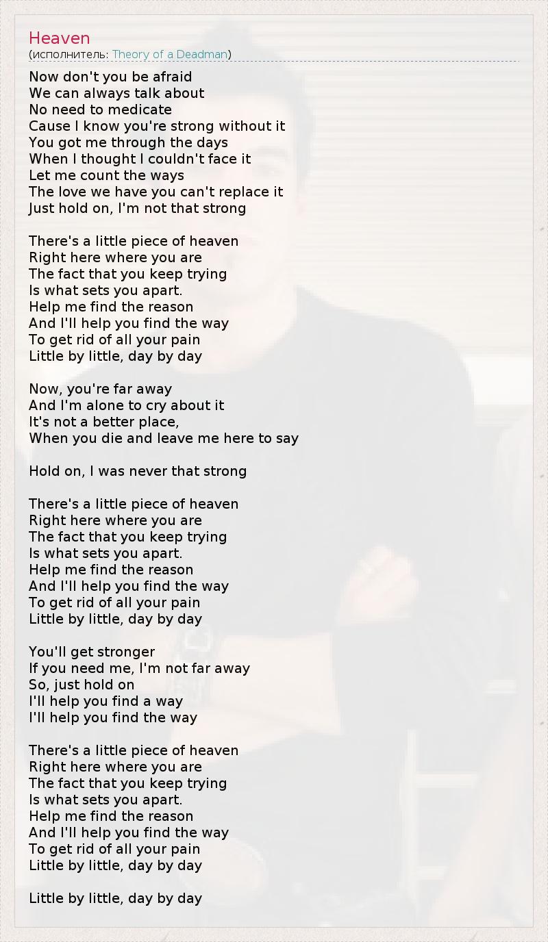 Это интересно:Theory of a Deadman - это рок-группа из города Дельта, Канада, основанная в 2001 году. В настоящее время группа имеет контракт с лейблом Roadrunner Records. Стиль группы вобрал в себя много от разных музыкальных жанров, в том числе кантри и акустический рок, а основой является... продолжение
