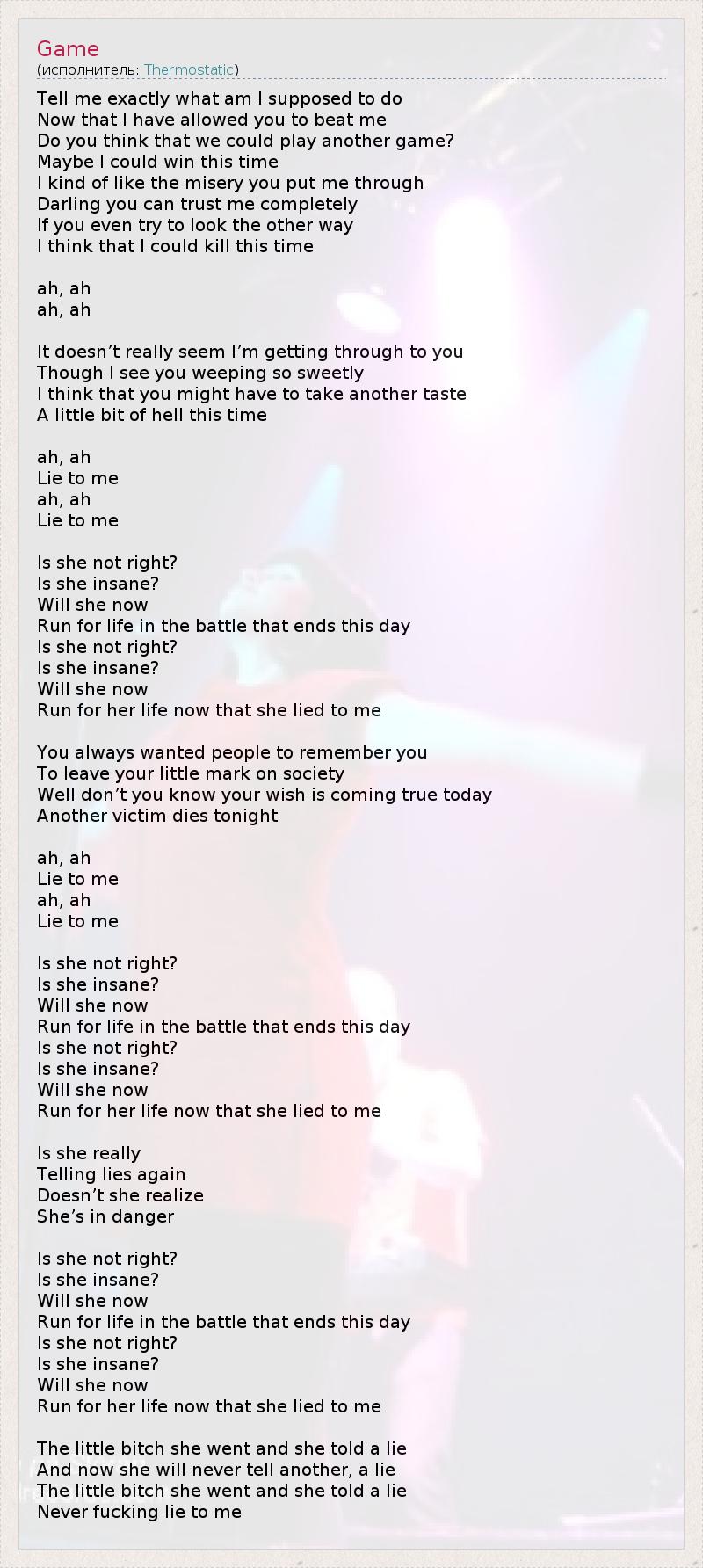 Скажи мне точно, чего ты хочешь от меня? Теперь, когда я позволил победить себя. Как думаешь, могли бы мы сыграть ещё раз? Возможно, в этот раз я выиграю. Мне почти нравится, как ты меня унижаешь, Дорогая, можешь полностью мне поверить, Если ты хоть попытаешься взглянуть по-другому, Думаю, в этот раз я могу и убить. А, а А, а На самом деле не похоже, что мои слова до тебя доходят, Хотя я вижу, как мило ты рыдаешь. Я думаю, что возможно, тебе придётся Отведать ещё небольшую порцию ада. А, а, Солги мне, А, а, Солги мне! Она не в порядке? Она сумасшедшая? Станет ли она Бороться за жизнь в битве, которая кончится сегодня? Она не в порядке? Она сумасшедшая? Станет ли она Бороться за жизнь после того, как обманула меня? Ты всегда хотела, чтобы тебя запомнили, Оставить о себе память в обществе, Ну и, ты не понимаешь, что твоя мечта сегодня воплотится в жизнь? Ещё одна жертва умрёт сегодня. А, а, Солги мне, А, а, Солги мне! Она не в порядке? Она сумасшедшая? Станет ли она Бороться за жизнь в битве, которая кончится сегодня? Она не в порядке? Она сумасшедшая? Станет ли она Бороться за жизнь после того, как обманула меня? Неужели она действительно Снова лжёт? Неужели она не понимает, Что её жизнь висит на волоске? Она не в порядке? Она сумасшедшая? Станет ли она Бороться за жизнь в битве, которая кончится сегодня? Она не в порядке? Она сумасшедшая? Станет ли она Бороться за жизнь после того, как обманула меня? Маленькая су*ка, она пришла и солгала мне, А теперь она никогда не солжёт больше, Маленькая су*а, она пришла и солгала мне, Никогда, бл***, не ври мне!