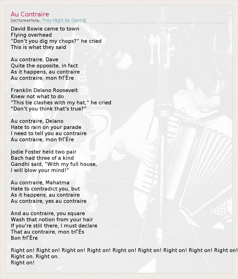 David Bowie came to town Flying overhead "Don't you dig my chops?" he cried This is what they said Au contraire, Dave Quite the opposite, in fact As it happens, au contraire Au contraire, mon frГЁre Franklin Delano Roosevelt Knew not what to do "This tie clashes with my hat," he cried "Don't you think that's true?" Au contraire, Delano Hate to rain on your parade I need to tell you au contraire Au contraire, mon frГЁre Jodie Foster held two pair Bach had three of a kind Gandhi said, "With my full house, I will blow your mind!" Au contraire, Mahatma Hate to contradict you, but As it happens, au contraire Au contraire, yes au contraire And au contraire, you square Wash that notion from your hair If you're still there, I must declare That au contraire, mon trГЁs Bon frГЁre Right on! Right on! Right on! Right on! Right on! Right on! Right on! Right on! Right on! Right on. Right on. Right on!