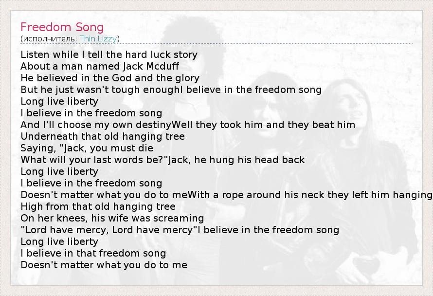 Listen while I tell the hard luck story About a man named Jack Mcduff He believed in the God and the glory But he just wasn't tough enoughI believe in the freedom song Long live liberty I believe in the freedom song And I'll choose my own destinyWell they took him and they beat him Underneath that old hanging tree Saying, "Jack, you must die What will your last words be?"Jack, he hung his head back Long live liberty I believe in the freedom song Doesn't matter what you do to meWith a rope around his neck they left him hanging High from that old hanging tree On her knees, his wife was screaming "Lord have mercy, Lord have mercy"I believe in the freedom song Long live liberty I believe in that freedom song Doesn't matter what you do to me