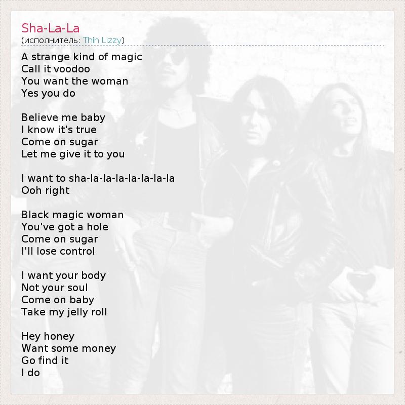 A strange kind of magic Call it voodoo You want the woman Yes you do Believe me baby I know it's true Come on sugar Let me give it to you I want to sha-la-la-la-la-la-la-la Ooh right Black magic woman You've got a hole Come on sugar I'll lose control I want your body Not your soul Come on baby Take my jelly roll Hey honey Want some money Go find it I do