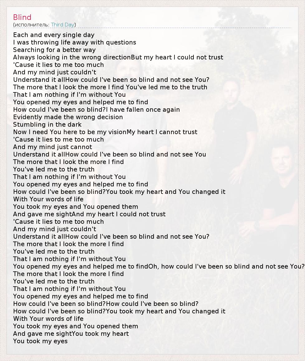 Это интересно:Third Day была основана в начале 90-х годов вокалистом Маком Пауэллом и гитаристом Марком Ли. Название группы - это еще одно напоминание о том, что Иисус воскрес из мертвых на третий день.За годы творчества музыканты группы выпустили много потрясающих альбомов, за три из которых ("Wire", "Come Together" и "Wherever You Are") они были удостоины премии Грэмми.