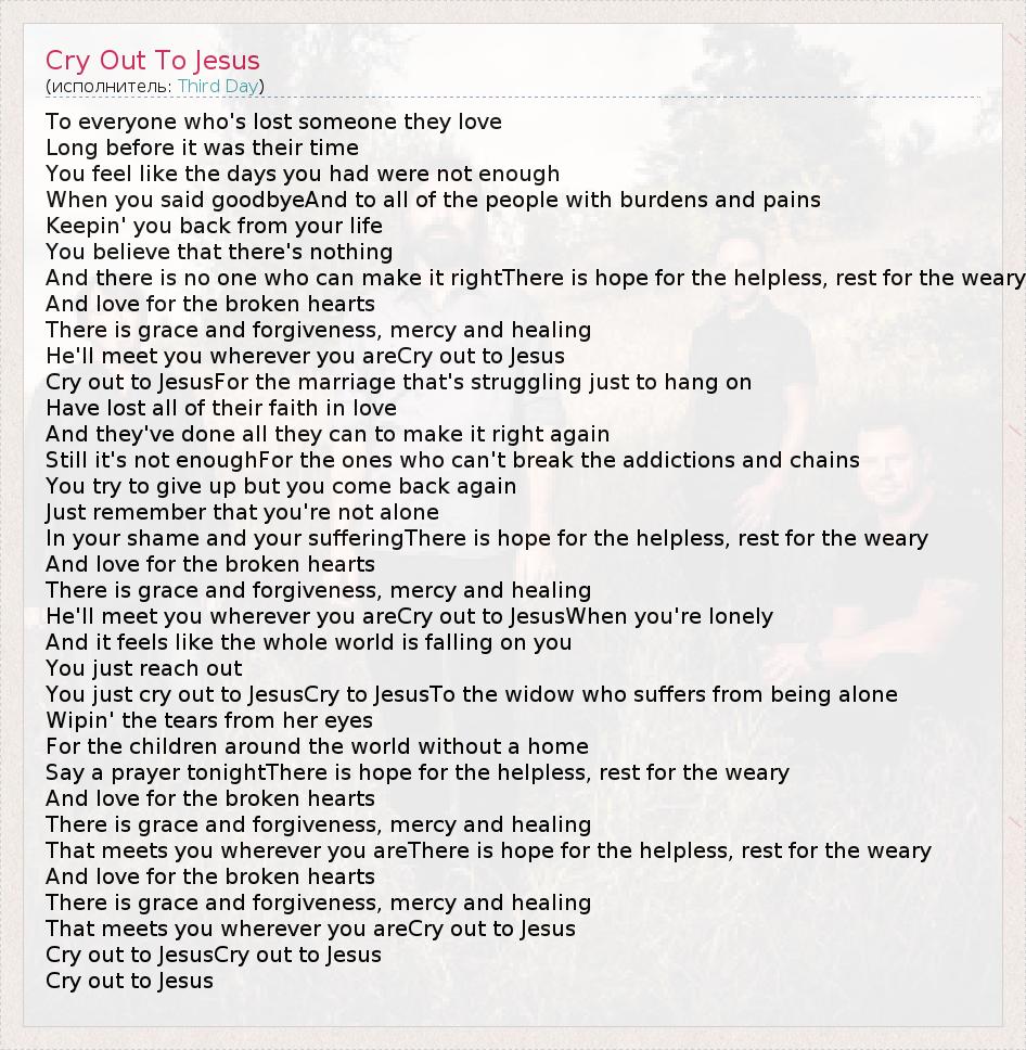 To everyone who's lost someone they love Long before it was their time You feel like the days you had were not enough When you said goodbyeAnd to all of the people with burdens and pains Keepin' you back from your life You believe that there's nothing And there is no one who can make it rightThere is hope for the helpless, rest for the weary And love for the broken hearts There is grace and forgiveness, mercy and healing He'll meet you wherever you areCry out to Jesus Cry out to JesusFor the marriage that's struggling just to hang on Have lost all of their faith in love And they've done all they can to make it right again Still it's not enoughFor the ones who can't break the addictions and chains You try to give up but you come back again Just remember that you're not alone In your shame and your sufferingThere is hope for the helpless, rest for the weary And love for the broken hearts There is grace and forgiveness, mercy and healing He'll meet you wherever you areCry out to JesusWhen you're lonely And it feels like the whole world is falling on you You just reach out You just cry out to JesusCry to JesusTo the widow who suffers from being alone Wipin' the tears from her eyes For the children around the world without a home Say a prayer tonightThere is hope for the helpless, rest for the weary And love for the broken hearts There is grace and forgiveness, mercy and healing That meets you wherever you areThere is hope for the helpless, rest for the weary And love for the broken hearts There is grace and forgiveness, mercy and healing That meets you wherever you areCry out to Jesus Cry out to JesusCry out to Jesus Cry out to Jesus
