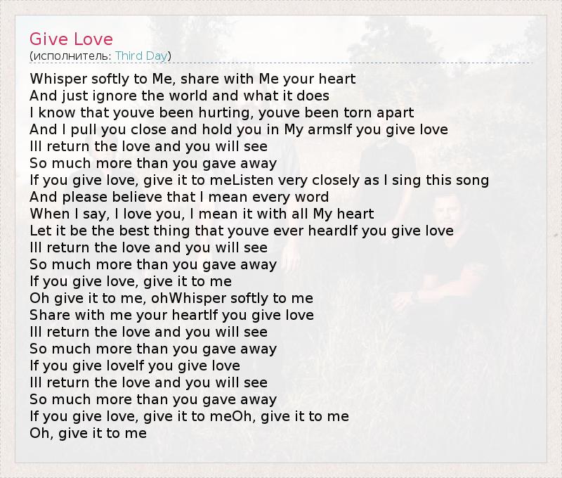 Whisper softly to Me, share with Me your heart And just ignore the world and what it does I know that youve been hurting, youve been torn apart And I pull you close and hold you in My armsIf you give love Ill return the love and you will see So much more than you gave away If you give love, give it to meListen very closely as I sing this song And please believe that I mean every word When I say, I love you, I mean it with all My heart Let it be the best thing that youve ever heardIf you give love Ill return the love and you will see So much more than you gave away If you give love, give it to me Oh give it to me, ohWhisper softly to me Share with me your heartIf you give love Ill return the love and you will see So much more than you gave away If you give loveIf you give love Ill return the love and you will see So much more than you gave away If you give love, give it to meOh, give it to me Oh, give it to me