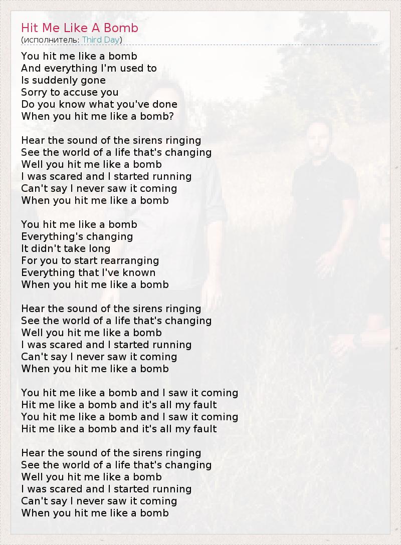 Ты взорвала меня, словно бомба, И всё, к чему я привык, Вдруг исчезло. Прости, что упрекаю тебя, но Ты понимаешь, что наделала, Когда взорвала меня, словно бомба? Слышу звук воющих сирен, Смотрю, как вся моя жизнь меняется, Да, ты взорвала меня, словно бомба. Я испугался и вдруг побежал, Не могу сказать, что не мог предвидеть этого, Когда ты взорвала меня, словно бомба. Ты взорвала меня, словно бомба, Всё вокруг меняется. Тебе понадобилось не так уж много времени, Чтобы переустроить всё, Что я когда либо знал, Когда ты взорвала меня, словно бомба. Слышу звук воющих сирен, Смотрю, как вся моя жизнь меняется, Да, ты взорвала меня, словно бомба. Я испугался и вдруг побежал, Не могу сказать, что не мог предвидеть этого, Когда ты взорвала меня, словно бомба. Ты взорвала меня и я это предвидел, Взорвала меня, словно бомба, и это моя вина. Ты взорвала меня и я это предвидел, Взорвала меня, словно бомба, и это моя вина. Слышу звук воющих сирен, Смотрю, как вся моя жизнь меняется, Да, ты взорвала меня, словно бомба. Я испугался и вдруг побежал, Не могу сказать, что не мог предвидеть этого, Когда ты взорвала меня, словно бомба.