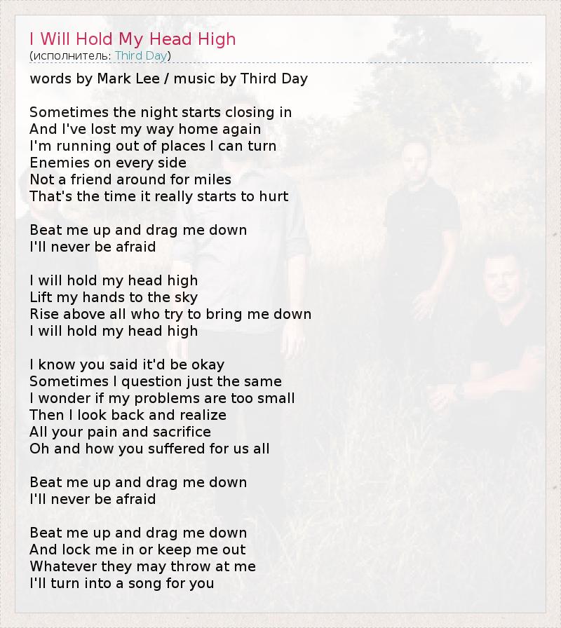 words by Mark Lee / music by Third Day Sometimes the night starts closing in And I've lost my way home again I'm running out of places I can turn Enemies on every side Not a friend around for miles That's the time it really starts to hurt Beat me up and drag me down I'll never be afraid I will hold my head high Lift my hands to the sky Rise above all who try to bring me down I will hold my head high I know you said it'd be okay Sometimes I question just the same I wonder if my problems are too small Then I look back and realize All your pain and sacrifice Oh and how you suffered for us all Beat me up and drag me down I'll never be afraid Beat me up and drag me down And lock me in or keep me out Whatever they may throw at me I'll turn into a song for you