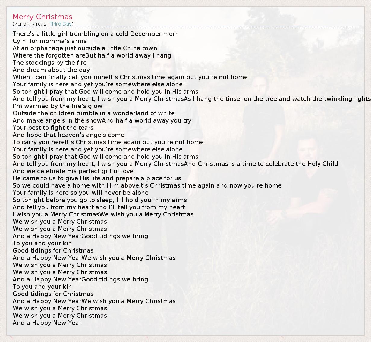 Это интересно:Third Day была основана в начале 90-х годов вокалистом Маком Пауэллом и гитаристом Марком Ли. Название группы - это еще одно напоминание о том, что Иисус воскрес из мертвых на третий день.За годы творчества музыканты группы выпустили много потрясающих альбомов, за три из которых ("Wire", "Come Together" и "Wherever You Are") они были удостоины премии Грэмми.