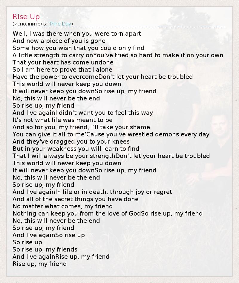 Это интересно:Third Day была основана в начале 90-х годов вокалистом Маком Пауэллом и гитаристом Марком Ли. Название группы - это еще одно напоминание о том, что Иисус воскрес из мертвых на третий день.За годы творчества музыканты группы выпустили много потрясающих альбомов, за три из которых ("Wire", "Come Together" и "Wherever You Are") они были удостоины премии Грэмми.