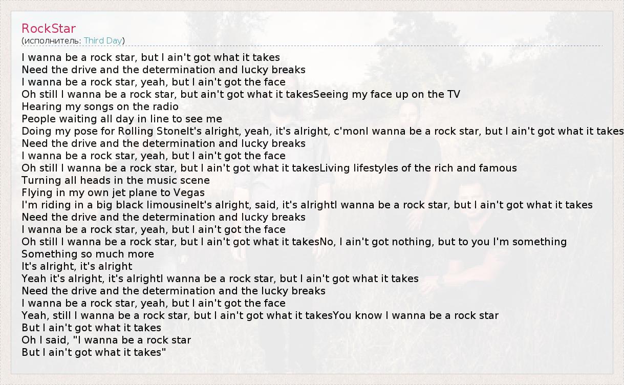 Yeah, still I wanna be a rock star, but I ain't got what it takesYou know I wanna be a rock star