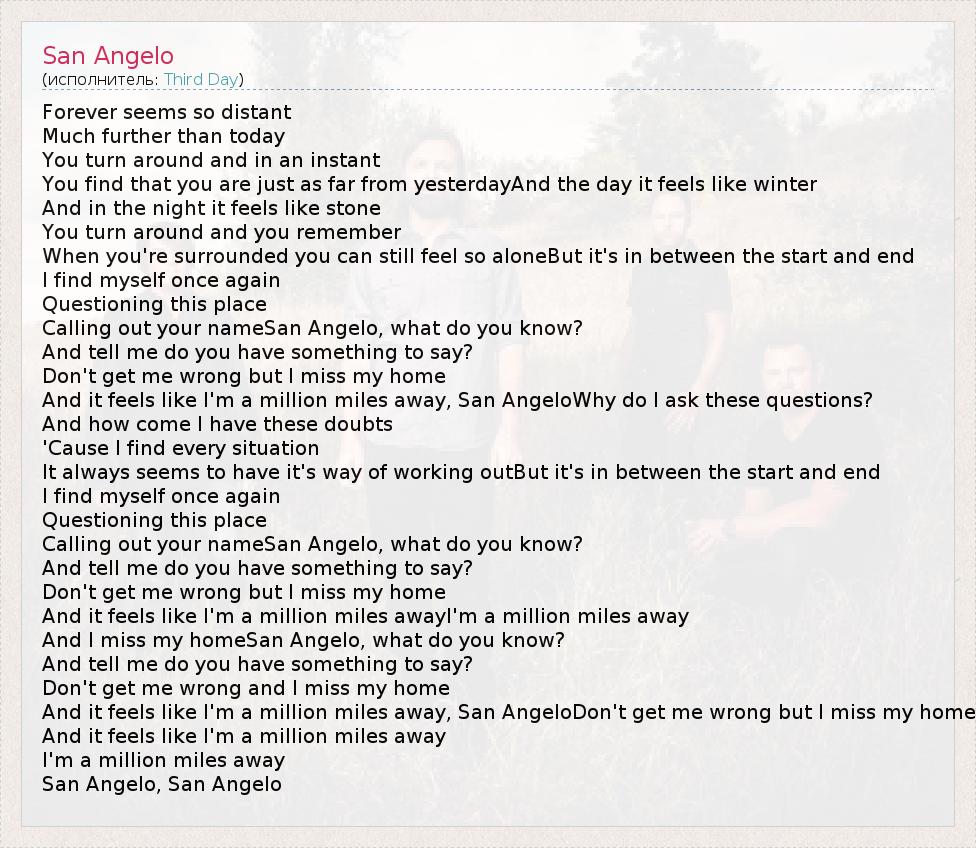 Forever seems so distant Much further than today You turn around and in an instant You find that you are just as far from yesterdayAnd the day it feels like winter And in the night it feels like stone You turn around and you remember When you're surrounded you can still feel so aloneBut it's in between the start and end I find myself once again Questioning this place Calling out your nameSan Angelo, what do you know? And tell me do you have something to say? Don't get me wrong but I miss my home And it feels like I'm a million miles away, San AngeloWhy do I ask these questions? And how come I have these doubts 'Cause I find every situation It always seems to have it's way of working outBut it's in between the start and end I find myself once again Questioning this place Calling out your nameSan Angelo, what do you know? And tell me do you have something to say? Don't get me wrong but I miss my home And it feels like I'm a million miles awayI'm a million miles away And I miss my homeSan Angelo, what do you know? And tell me do you have something to say? Don't get me wrong and I miss my home And it feels like I'm a million miles away, San AngeloDon't get me wrong but I miss my home And it feels like I'm a million miles away I'm a million miles away San Angelo, San Angelo