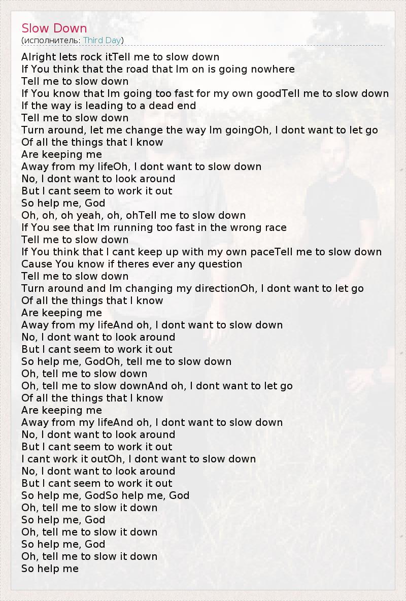 Alright lets rock itTell me to slow down If You think that the road that Im on is going nowhere Tell me to slow down If You know that Im going too fast for my own goodTell me to slow down If the way is leading to a dead end Tell me to slow down Turn around, let me change the way Im goingOh, I dont want to let go Of all the things that I know Are keeping me Away from my lifeOh, I dont want to slow down No, I dont want to look around But I cant seem to work it out So help me, God Oh, oh, oh yeah, oh, ohTell me to slow down If You see that Im running too fast in the wrong race Tell me to slow down If You think that I cant keep up with my own paceTell me to slow down Cause You know if theres ever any question Tell me to slow down Turn around and Im changing my directionOh, I dont want to let go Of all the things that I know Are keeping me Away from my lifeAnd oh, I dont want to slow down No, I dont want to look around But I cant seem to work it out So help me, GodOh, tell me to slow down Oh, tell me to slow down Oh, tell me to slow downAnd oh, I dont want to let go Of all the things that I know Are keeping me Away from my lifeAnd oh, I dont want to slow down No, I dont want to look around But I cant seem to work it out I cant work it outOh, I dont want to slow down No, I dont want to look around But I cant seem to work it out So help me, GodSo help me, God Oh, tell me to slow it down So help me, God Oh, tell me to slow it down So help me, God Oh, tell me to slow it down So help me