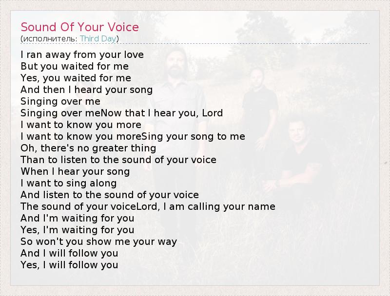 I ran away from your love But you waited for me Yes, you waited for me And then I heard your song Singing over me Singing over meNow that I hear you, Lord I want to know you more I want to know you moreSing your song to me Oh, there's no greater thing Than to listen to the sound of your voice When I hear your song I want to sing along And listen to the sound of your voice The sound of your voiceLord, I am calling your name And I'm waiting for you Yes, I'm waiting for you So won't you show me your way And I will follow you Yes, I will follow you