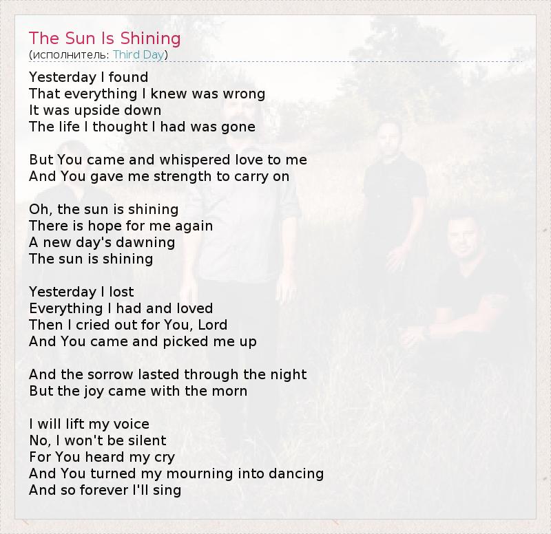 Yesterday I found That everything I knew was wrong It was upside down The life I thought I had was gone But You came and whispered love to me And You gave me strength to carry on Oh, the sun is shining There is hope for me again A new day's dawning The sun is shining Yesterday I lost Everything I had and loved Then I cried out for You, Lord And You came and picked me up And the sorrow lasted through the night But the joy came with the morn I will lift my voice No, I won't be silent For You heard my cry And You turned my mourning into dancing And so forever I'll sing
