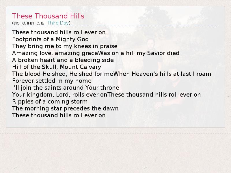 These thousand hills roll ever on Footprints of a Mighty God They bring me to my knees in praise Amazing love, amazing graceWas on a hill my Savior died A broken heart and a bleeding side Hill of the Skull, Mount Calvary The blood He shed, He shed for meWhen Heaven's hills at last I roam Forever settled in my home I'll join the saints around Your throne Your kingdom, Lord, rolls ever onThese thousand hills roll ever on Ripples of a coming storm The morning star precedes the dawn These thousand hills roll ever on